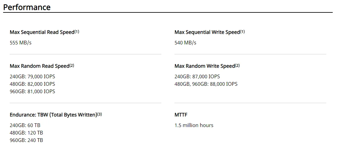 (1) Твердотельный накопитель/твердотельный накопитель Workout Ia PLUS: скорость измеряется последовательно с помощью CrystalDiskMark 6.0.2 x64, Q = 32, T = 1 Твердотельный накопитель SATA: последовательные скорости измеряются с помощью ATTO v3.05, QD10 (2) Твердотельный накопитель Workout Ia PLUS/твердотельный накопитель Workout Ia: производительность в 4 варианта измеряется с помощью CrystalDiskMark 6.0.2 x64, Q = 32,T = 8 Эксклюзивный SATA: производительность в 4 варианта измеряется с помощью CrystalDiskMark 5. 2 x64 QD32 (3) Твердотельный накопитель/твердотельный накопитель Workout Ia PLUS SSD: определение и условия TBW (написано терабайты) основаны на стандарте JEDEC; Твердотельный накопитель JESD219A (твердотельный накопитель SSD), июль 2012 г., И определяется для срока службы. Твердотельный накопитель с SATA: определение и условия TBW (написаны терабайты) основаны на стандарте JEDEC; JESD218A, февраль 2011 года, и определены для срока службы. (4) гарантия производителя действует либо (I) гарантийный срок с даты покупки в оригинальной запечатанной упаковке, либо (II) за промежуток времени до нуля "оставшегося процентного срока жизни", в зависимости от того, что меньше. "Оставшийся процент жизни" можно найти с помощью манометра "Здоровье" утилиты SSD для продуктов KIOXIA, который доступен по адресу "personal.kioxia.com/support/". Определение емкости: KIOXIA определяет мегабайт (МБ) как 1000000 байт, гигабайт (ГБ) как 1000000000 байт, а терабайт (ТБ)-1000000000000 байт. Операционная система компьютера сообщает о емкости хранилища, используя 2 способа определения 1 ГБ = 230 = 1073741824 байт, и поэтому показывает меньшую емкость памяти. Доступная емкость хранилища (включая примеры различных медиафайлов) зависит от размера, форматирования, настроек, программного обеспечения и операционной системы, например операционной системы Microsoft и/или предустановленных программных приложений, или медиа-контент. Фактическая отформатированная емкость может отличаться. Кибибайт (КиБ) означает 210 или 1024 байт, мебибайт (MiB)-220 или 1048576 байт, а гибибайт (Гиб)-230 или 1073741824 байт. Ввода-вывод в секунду (или количество операций ввода-вывода в секунду) MTTF (среднее время до выхода из строя) не является гарантией или оценкой срока службы товара; это статистическая стоимость, связанная со средними показателями отказов для большого количества товаров, которые могут неточно отражать фактическую эксплуатацию. Фактический срок эксплуатации изделия может отличаться от MTTF. Скорость чтения и записи может варьироваться в зависимости от хост-устройства, условий чтения и записи и размера файла. При условии изменения: пока KIOXIA приложила все усилия на момент публикации для обеспечения точности предоставленной здесь информации, спецификаций, конфигураций, цен, доступность системы/компонента/опций может изменяться без уведомления. Изображение товара может представлять дизайнерскую модель. Изображения только для иллюстрации. Внешний вид товара может отличаться от фактического товара. Фактическое количество компонентов вспышки отличается емкостью накопителя.