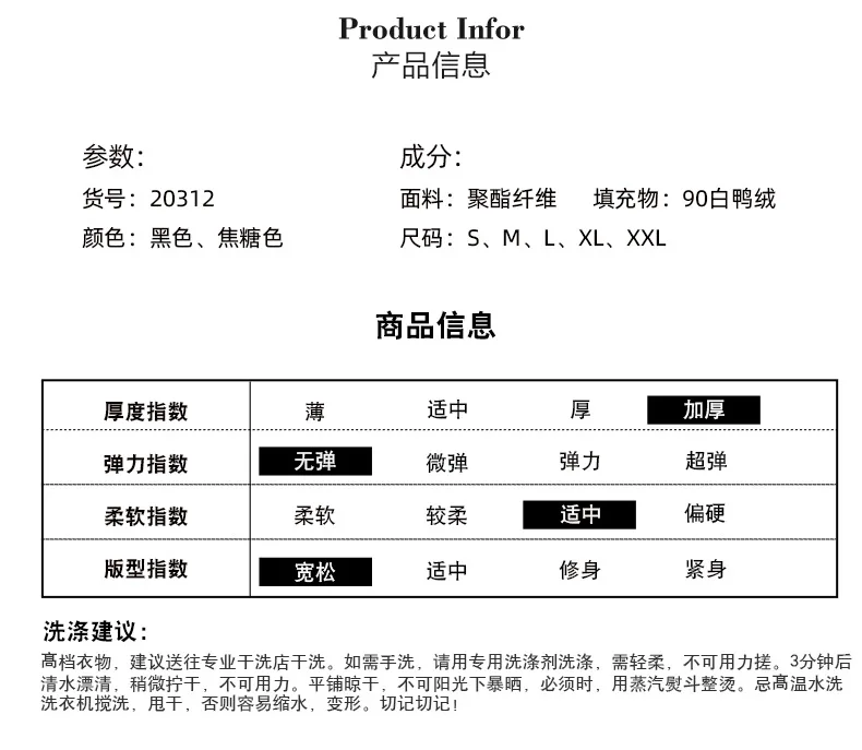 | Размеры | Грудь (см) | Талия(См) | Плечо (см) | Длина рукава(См) | Содержание Пуха (г) | Длина по центру спинки (см) | Вес заполнения (г) |