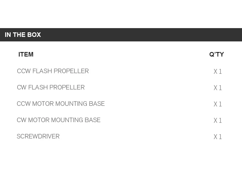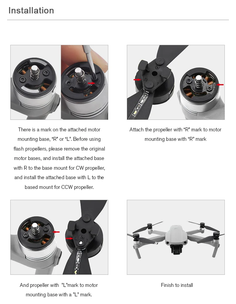 -Есть отметка на прикрепленном монтажном основании двигателя, ''r'' или'' l''. Перед использованием пропеллеров вспышки, пожалуйста, удалите исходные двигательные базы и установите прикрепленную базу с R к основному креплению для CW пропеллера, И установите прикрепленное основание с L на опорное крепление для пропеллера CCW.