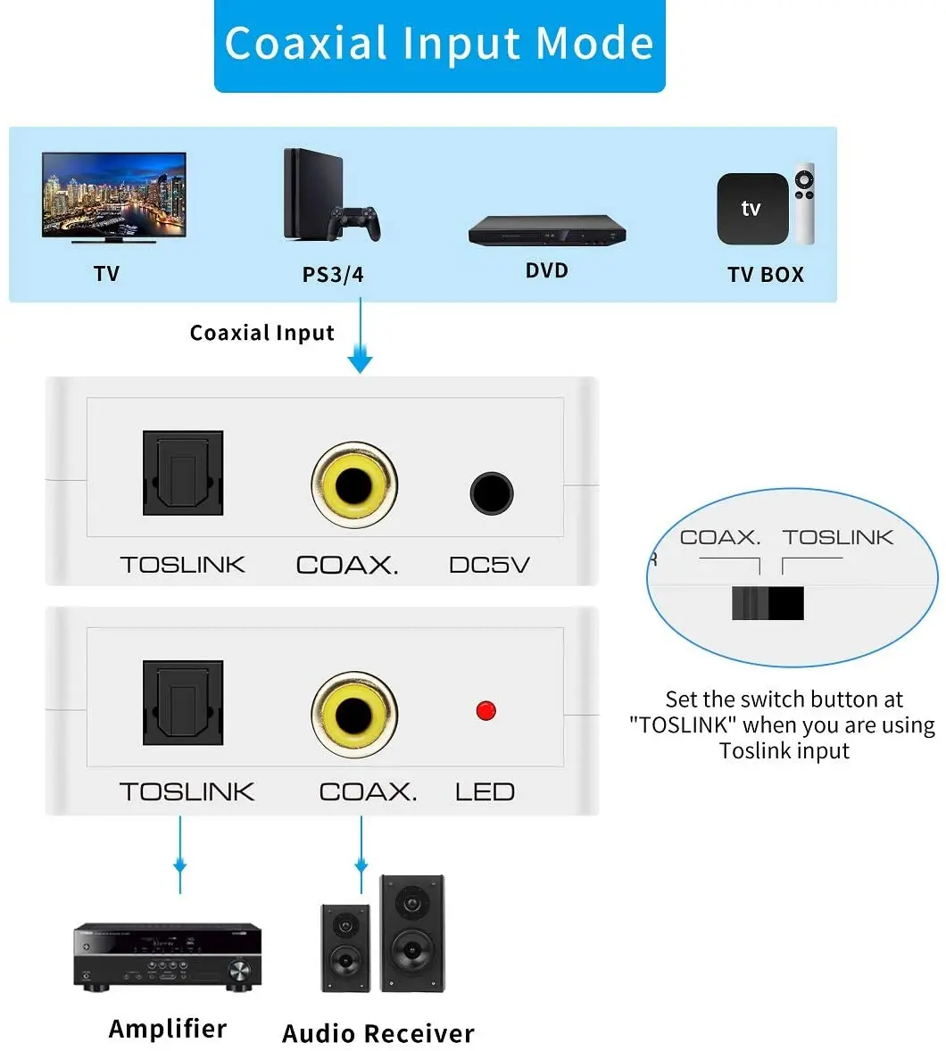 [Двунаправленный цифровой o конвертер] преобразует SPDIF сигналы различных методов передачи. Оптический к коаксиальному и оптическому, или коаксиальный к коаксиальному и оптическому, просто кнопка переключения для выбора входного сигнала.[Несколько форматов o] o вход и выход Поддержка o Формат: LPCM/ DTS/ DOLBY-AC3. И наибольшая поддержка частоты дискретизации 192 кГц. Передача без шума, высокая четкость вывода для вашего усилителя и динамика.