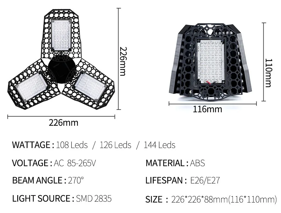 Мощность: 108 светодиодов/126 светодиодов/144 светодиодов; Напряжение: AC85-265V; Угол рассеивания света: 270 °; Срок службы: E26/E27; Источник света: SMD2835; Размер: 226*226*88 мм (116*110 мм). Размер измеряется вручную, возможна погрешность в 1-3 см, фактический продукт превалирует
