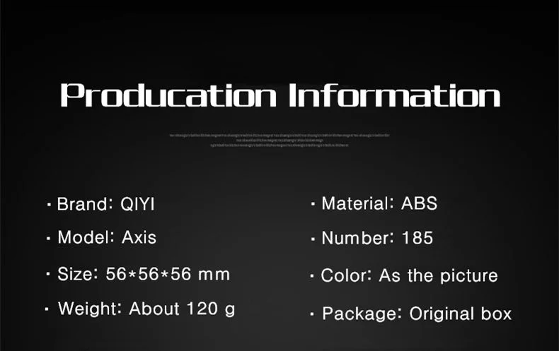 Marque: QIYIModel: cube axisColor: черный/без glueMaterial: ABSLevel: 3x3x3Cube: 5,7*5,7*5,7 см