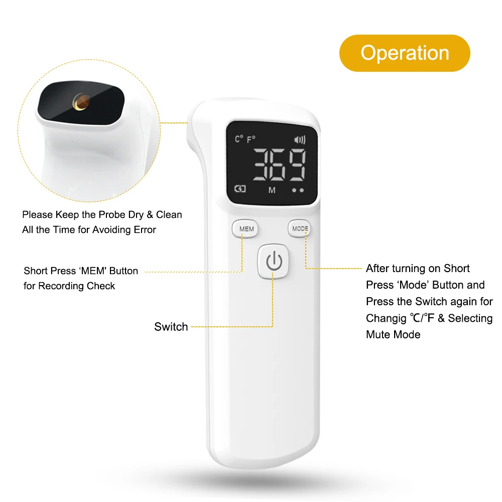 Этот Бесконтактный инфракрасный термометр полезен для измерения температуры тела. Помогает вам узнать Вашу ситуацию как можно скорее. Чего вы ждете? Просто приходите и покупайте. Особенности: Бесконтактное инфракрасное измерение, надежное в использовании. ЖК-прозрачный цифровой дисплей, информирующий вас о различных ситуациях тела, четкий дисплей, хороший вид. Удобная ручка, эргономичный и приятный опыт использования. Разработанный с функцией будильника, он предупреждает о заданной настройке будильника и может работать тихо с режимом отключения звука. 32 группы функций памяти для записи и легко изменить единицы измерения по мере необходимости. Питание от батареек, бесплатные счета и Экономичные. Мини-размер и вес, светильник портативный и компактный. Характеристики: Тип изделия: термометр Входное напряжение: D C 3 V Источник питания: 2 * AAA B-atteries (не предоставляется) Материал: АБС-пластик Цвет: белый Расстояние измерения: 10-50 мм Измерительный час: 0,5 секунд Автоматическое выключение: прибл. 20 секунд Диапазон измерения: Режим температуры тела 32 ℃ ~ 42,9 ℃ Точность: 32-34,9 ℃ ± 0,3 ℃ Большие размеры 35-42 ℃ ± 0,2 ℃ 42,1-42,9 ± 0,3 ℃ Рабочая температура: 10-40 ℃ Рабочая влажность: ≤ 80% Температура хранения: 0-50 ℃ Группы памяти: 32 Размер посылка: 175*60*50 мм/6,9*2,4*2 дюйма (длина * ширина * высота) Посылка Вес: 88 г/3,1 унций Примечание: Батареи не предоставляются. Упаковочный лист: 1 * Бесконтактный ИК-термометр 1 * Руководство пользователя