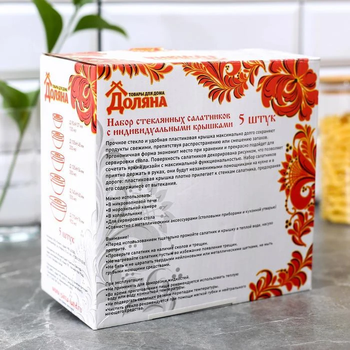 В набор салатников «Классика» входит 5 контейнеров разных размеров: 130, 200, 350, 500, 900 мл. Такое количество посуды обеспечит компактное хранение продуктов в холодильнике и позволит передавать гостинцы близким людям после праздников.