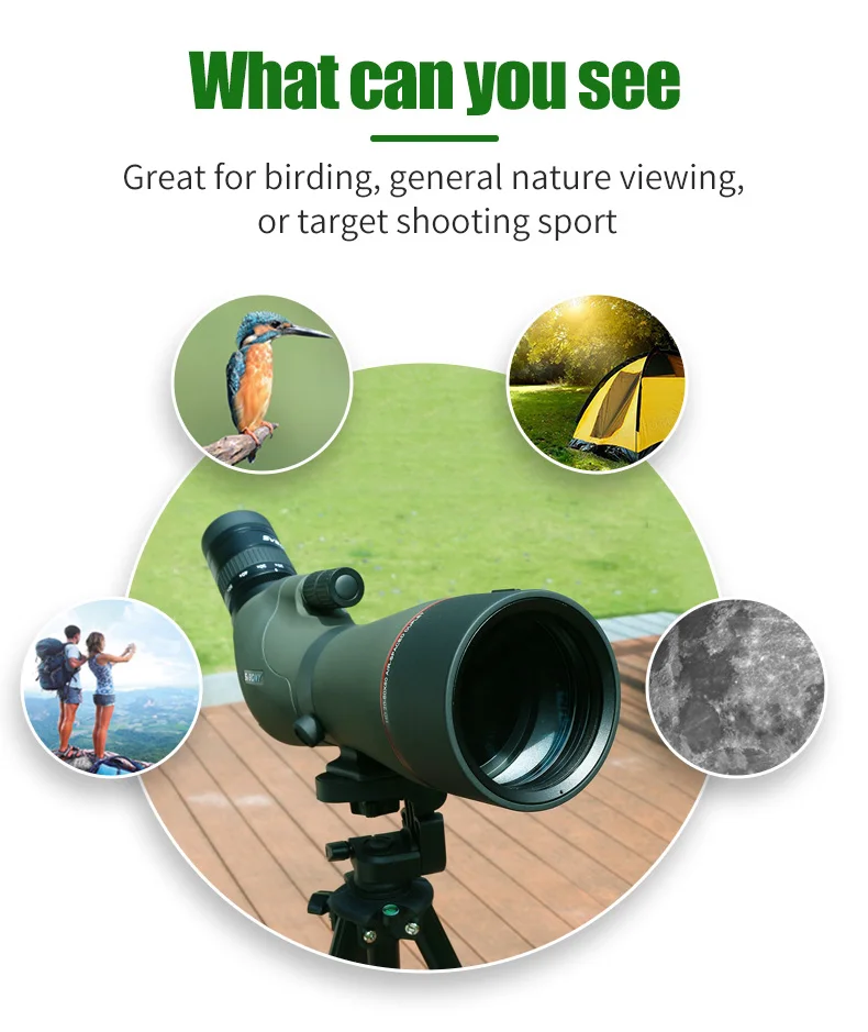 1. Полностью Многослойные линзы для ярких, резких видов даже при плохом освещении 2. Простой в использовании двойной скоростной фокусирующий циферблат делает фокусировку точной и быстрой 3.Eyeglass дружественные наглазники, многопозиционные поворотные наглазники удобны в использовании для использования с очками 4. Встроенный зум-объектив производит четкие изображения от 20X До 60X увеличения 5. Водонепроницаемый дизайн и включает мягкий чехол с молниями на обоих концах, так что область может быть защищена даже при установке на штатив 6. Фокус колеблется от 29,5 футов до горизонта с помощью всего нескольких поворотов ручки фокусировки 7. Металлический солнцезащитный козырек: уменьшает блики и защищает объектив от капель дождя 8. Адаптер штатива: 360 градусов регулируемый угол съемки, чтобы удовлетворить ваши потребности лучше 9. Отлично подходит для съемки птиц, общего просмотра природы или для стрельбы по мишеням