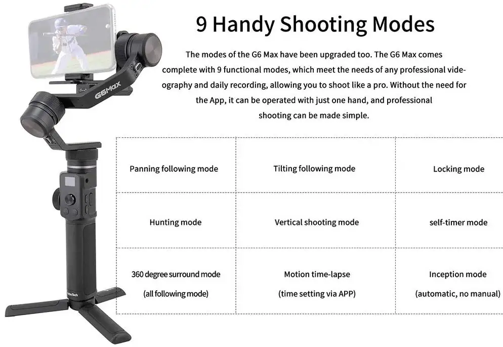 FeiyuTech G6 Max--- Все еще один для 4 с увеличенной полезной нагрузкой новый и улучшенный высокий крутящий момент, магнитные, бесщеточные двигатели могут похвастаться 50% увеличением выхода, что делает карданный шарнир совместимым с беззеркальными камерами, смартфонами, спортивные камеры и компактные камеры. В G6 Max может выдерживать до 1,2 кг, которые поддерживают сочетание нескольких камер и объективов для того, чтобы обеспечить более гибкое применение. Совместимость Камера/смартфон в стабильном Функция экшн-Камеры GoPro Hero 5/6/7/8 (Примечание: необходимо подключить GoPro зажим + T Тип адаптера, Т-образный adapteris стандартный аксессуар) sony RX100III / IV / V / VA /VI / M7 Series, a6000, a6300, a6400, a6500, a6600, a7M2, a7S II, a7 RII, A7S, a7R, a7, a5100, a5200, HDR-SR11E, HDR-CX270E, FDR-AS50, FDR-AS300, FDR-X3000R, ILCE-QX1, RX1R, NEX-5N, NEX-7, RX0, RX0 II Canon GX3, M50, g1X Mark II, G7X Mark II, G7X Mark III, EOS M, EOS M3, EOS M5, EOS M6,EOS M10, EOS M100, EOS 200D/ 200D II, EOS титановый Электролитный электрод со случайно выбранным Panasonic LX10, LX100 M2, Lumix DC-FT7, DC-ZS 70GK, DC-ZS220GK, DC-GF9XGK, DC-GF9KGK, DC-GF10KGK, DMC-ZS110, DMC-GX85, DMC-GX8, DMC-G2, GH4, G7, HC-V180 Nikon 1 J5 Leica D-lux FujiFilm X-A5, FujiFilm XT20 BlackMagic BMPCC первая версия смартфона: ширина смартфона должна быть 54-88mm.Like iPhone11,iPhone X,iPhone XR,iPhone Xs , iPhone XS Max,iPhone8,iPhone7Plus,iPhone 6s, HUAWEI P30, HUAWEI P20 Pro, HUAWEI P9,HUAWEI mate10, HUAWEI Honor V20, HUAWEI Honor 10, HUAWEI Nova4 , HUAWEI Nova 3e, MI 9,MI 8, Redmi 6 Pro, OPPO find X, OPPO R9s, Vivo NEX,Vivo X21, Vivo X23, Vivo X27,Vivo Y85, Samsung S10 +,Samsung Note 9,Samsung Note 8,Samsung Note 3, samsung S7,Smartisan Nut Pro2, One plus 3t, Google Pixel 3 и т. Д. Размер совместимой камеры s для справки: Высота камеры (включая высоту видоискателя) ≤ 105 мм расстояние от винтового отверстия до правого края камеры ≤ 87 мм Максимальная длина в направлении объектива: около 125 мм