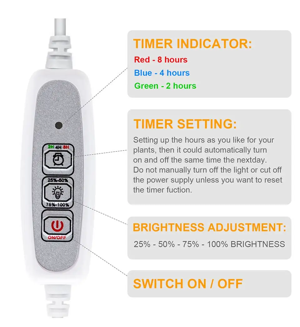 Этот светодиодный светильник для выращивания может быть установлен для выключения после 2H/4H/8H. После установки времени, не выключайте светильник или не отключайте питание вручную, светильник включается автоматически одновременно на следующий день.