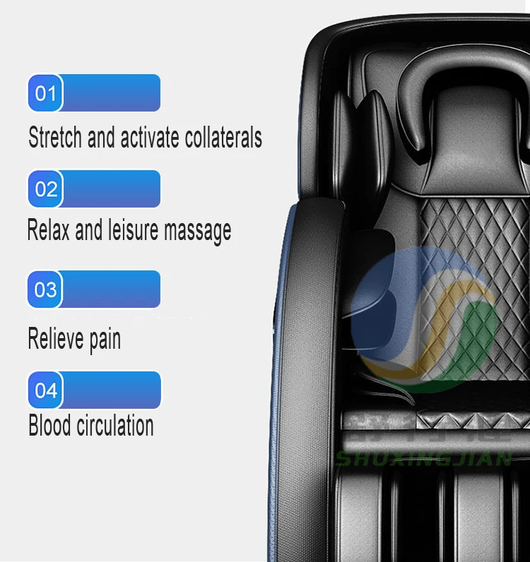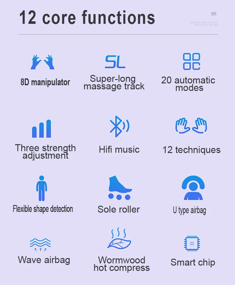 1) Нулевой гравитационный дизайн, подлокотник связывает капсулу, позволит вам испытать невесомость пространства; 2) Кривая SL, от шеи до ног, Адаптивная Массажная головка, подходит для человеческого тела, с воздушным мешком для бедер, более удобный массаж; 3) посылка с воздушным мешком для всего тела, массажный массаж, ритмичный массаж; 4) роликовый массаж ног стимулирует подошву стопы; 5) Различные Автоматические массажные процедуры, различные методы искусственного массажа; 6) теплое ощущение горячего сжатия, наслаждайтесь интимным массажем нагрева; 7) мобильное кресло оснащено массажным колесом в любом месте; 8) режим может быть изменен с помощью пульта дистанционного управления, и операция проста и удобна; 9) HiFi стерео объемный звук предназначен для наслаждения Bluetooth; 10) износостойкая, удобная и дышащая кожа с гуманным роллером; 11) продукт принимает дизайн дыхательной лампы, которая более атмосферная и более красивая.