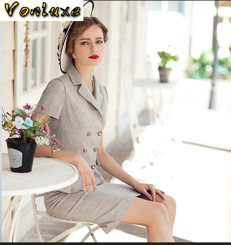 Женский костюм с юбкой, офисный винтажный двубортный топ и юбка-карандаш до колена, Офисная форма из 2 предметов, лето 2019