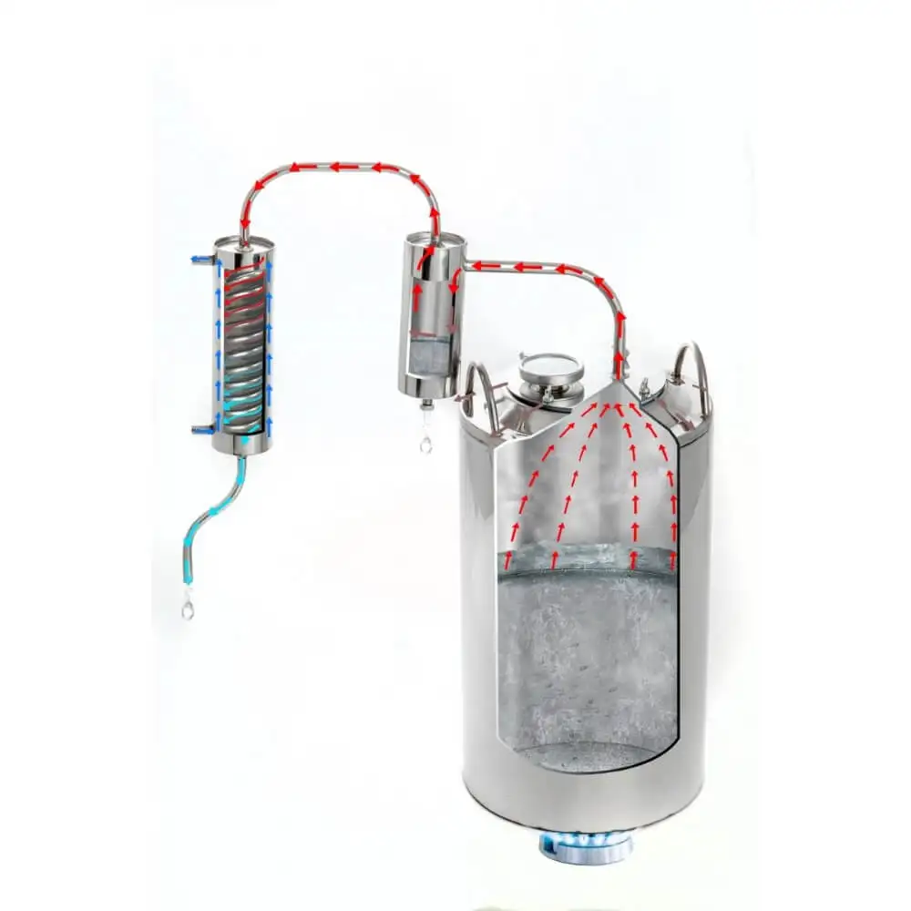 Сухопарник несомненно является преимуществом позволяющим отбирать большую часть сивушных масел еще до выхода готовой продукции. Позволяет выполнить слив сивушных масел, при наполнении и по окончанию работы, сливать содержимое необходимо через сливной кран расположенный в нижней части сухопарника.