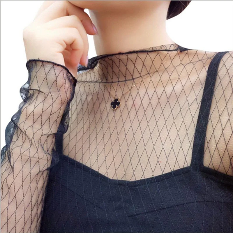 Женские топы, Сексуальная футболка с высоким воротом, черный сетчатый пуловер, новая модная одежда с длинным рукавом, винтажные Топы для женщин с длинными рукавамиПовод вечерние вечеринка, коктейль, отпуск или повседневная одежда