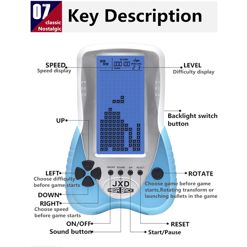 Номер 01-23, отображаемый в верхней части экрана,-это номер игры. Разные цифры соответствуют различным играм. Используйте повернуть, чтобы выбрать игру, соответствующую номеру. Номер 01-это классическая игра тетрис, и начинающему рекомендуется начать играть в эту игру. Консоль Tetris питается от батарей 3 * AAA.