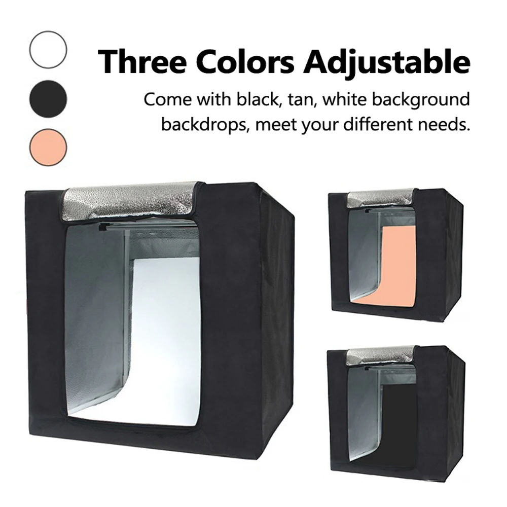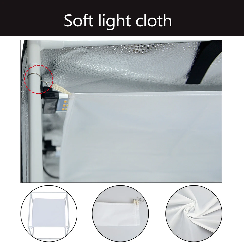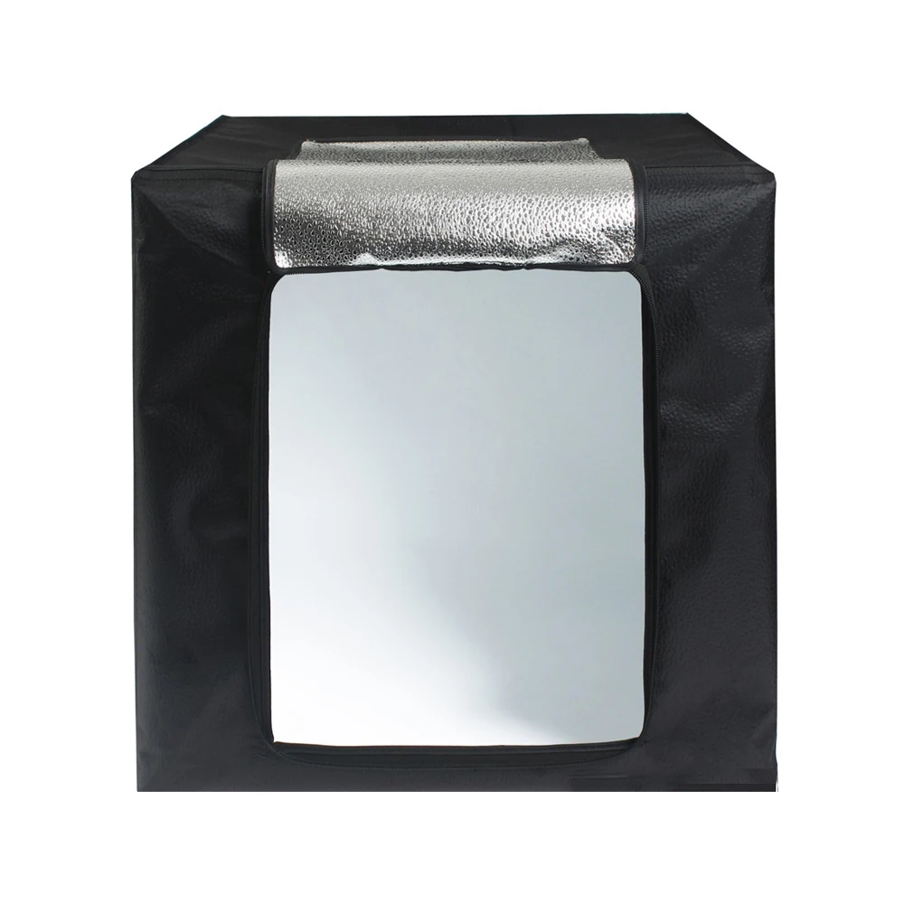 Отверстие может использоваться в качестве передней или верхней части софтбокса для обеспечения различных углов для фотосъемки. Всю переднюю часть палатки также можно расстегнуть на молнии, чтобы обеспечить более широкое отверстие для фотосъемки больших предметов. В комплект входят три фона: черный, белый и светло-коричневый. Фоны из гладкого ПВХ, поэтому их легко протирать.