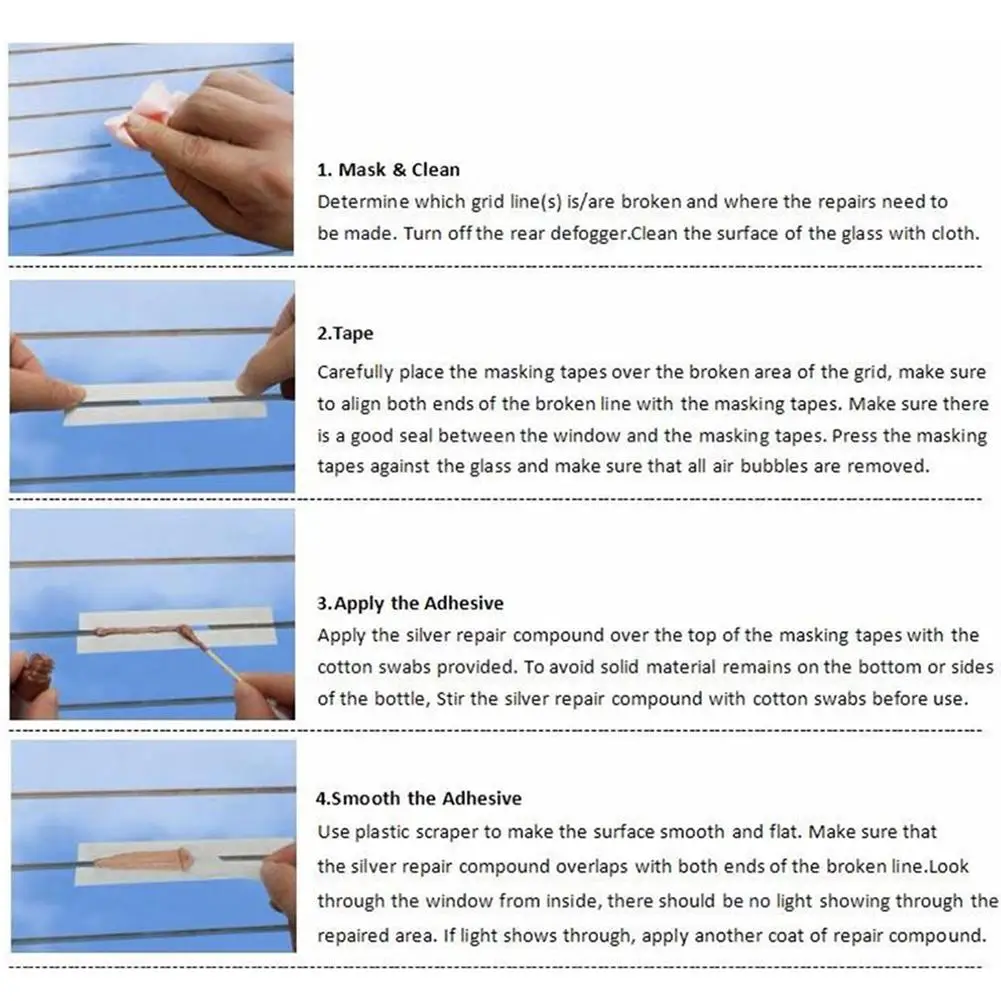 Используйте пластиковый скребок, чтобы сделать поверхности гладкими и плоскими. Убедитесь, что серебряное Ремонтное соединение перекрывает оба конца сломанной линии. Посмотрите через окно изнутри, светильник не должен быть показан через отремонтированную область. Если светильник просвечивается, нанесите другой слой ремонтной смеси.