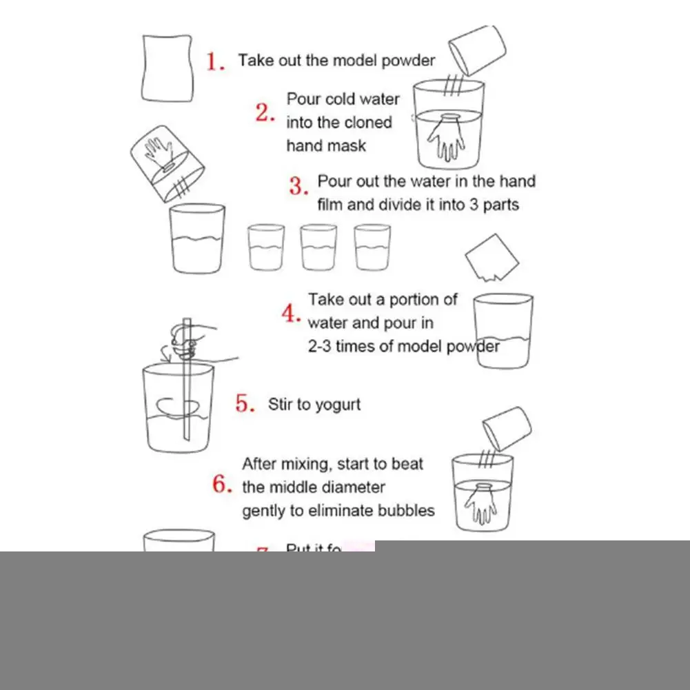 1. Смешайте формованный порошок с водой. Вставьте ногу или руку ребенка в литой контейнер. Форма устанавливается примерно через 75 секунд. Откачивайте ноги ребенка (или руки) из формовочного материала.