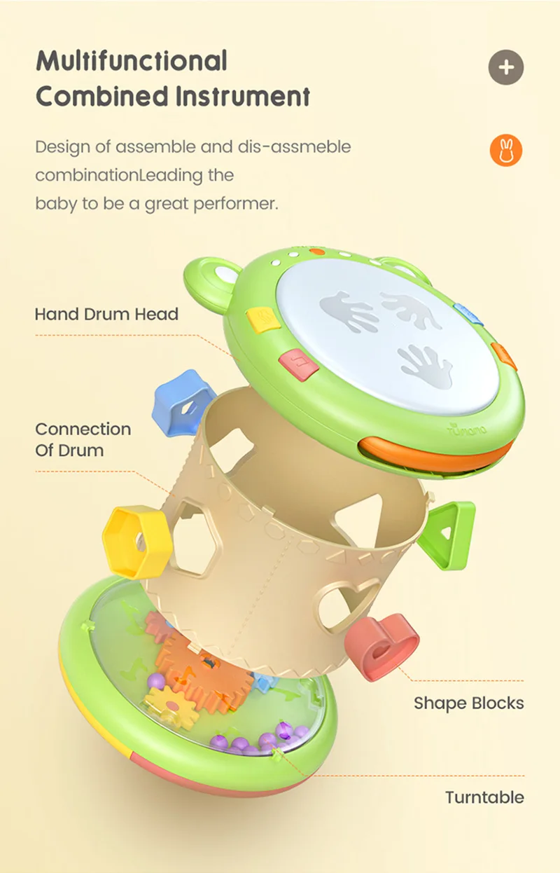 Дизайн «Два в одном», разработанный вручную в раннего детства. Побить барабаны, побить обеими руками или следовать за огнями. Сцепление с ручкой может быть легко достигнуто.