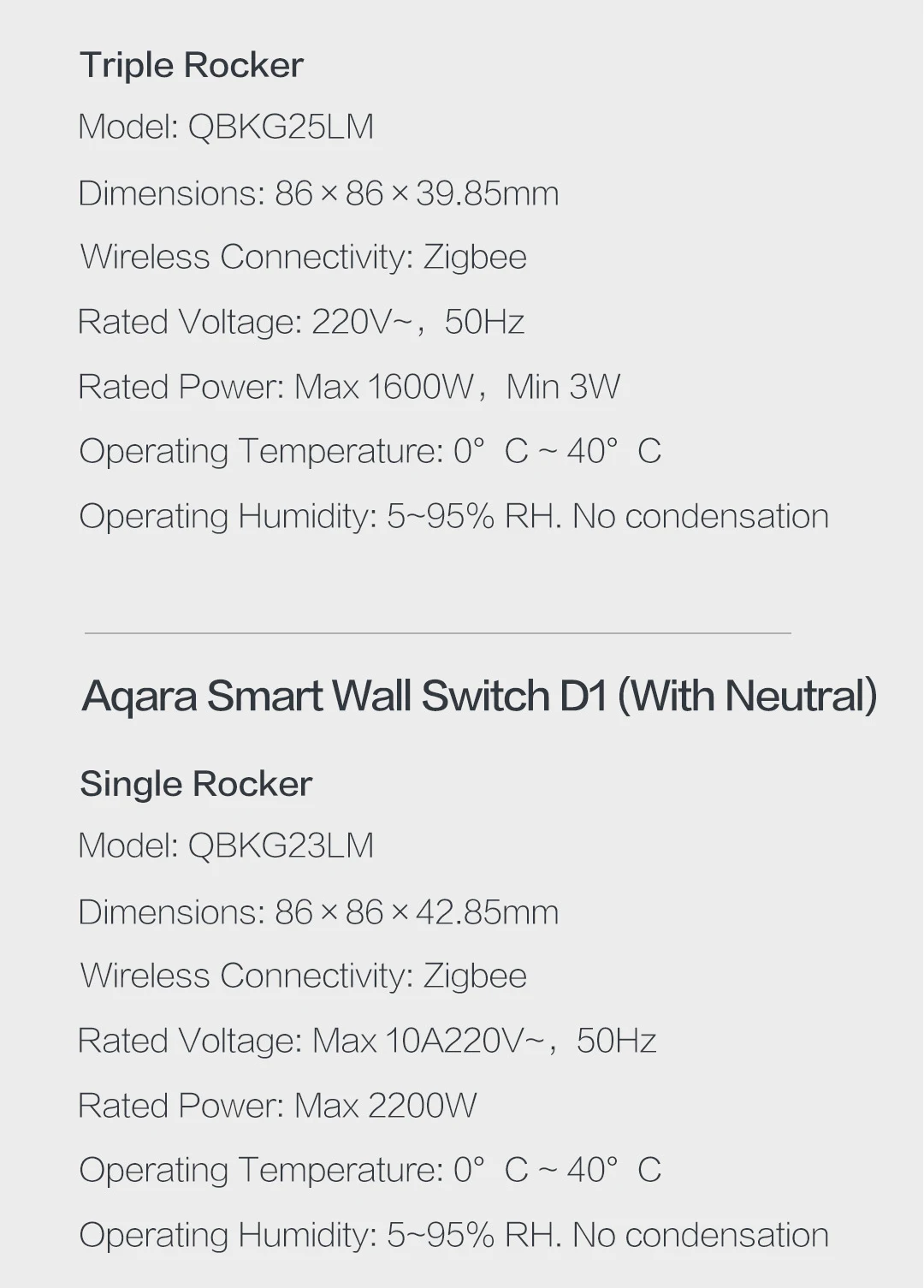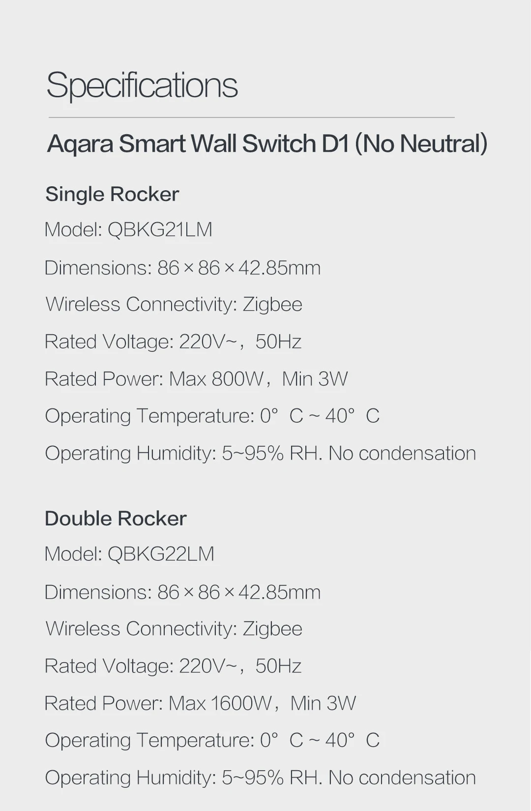 * Aqara настенный выключатель ZiGBee версия * Управление одной клавишей и двумя клавишами * Беспроводное соединение: ZigBee * Можно подключить к Aqara smart device или другому Zigbee device * Вход: одиночный firewire 220 В, 50 Гц * Диапазон нагрузки: не более 800 Вт/каждая, минимум: энергосберегающие лампы 3 Вт/светодиодные лампы 5 Вт/флуоресцентные лампы 16 Вт * Рабочая влажность: 5-95рст * Скачайте приложение «Mi Home» в Google Play или Apple Store