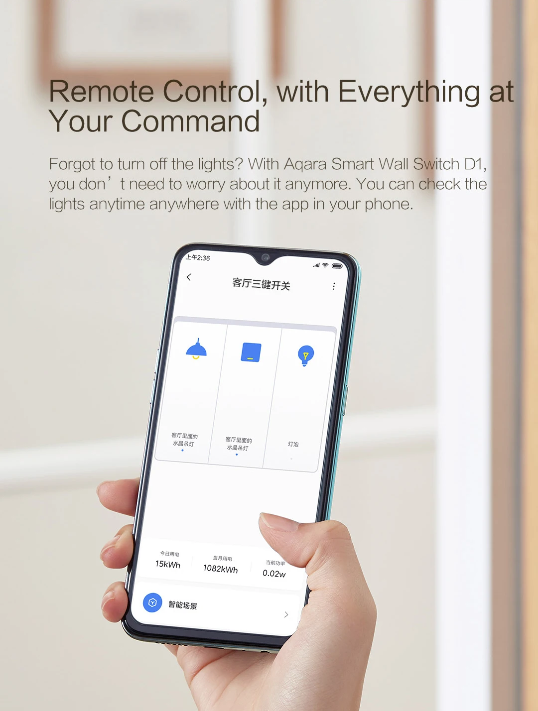 Легко Подключайтесь к концентратору Aqara/кондиционер контроллер по конкурентоспособной цене. Промышленный дизайн: простая большая панель со стандартной коробкой 86 мм, интегрированная с любым стилем дома. Чип: управляет освещением от 3 Вт, используется для большинства ламп на рынке Материал: Огнестойкий поликарбонатный материал класса V0 с УФ-покрытием и не выцветающий цвет для длительного использования. Функциональность: CQC сертифицирован, нажатие до 50000 раз. 6:30 утра Приятного дня с устройствами с утра до ночи Расписание вклюсветильник и разбудить вас утром 7:00 утра Выключить свет дистанционно