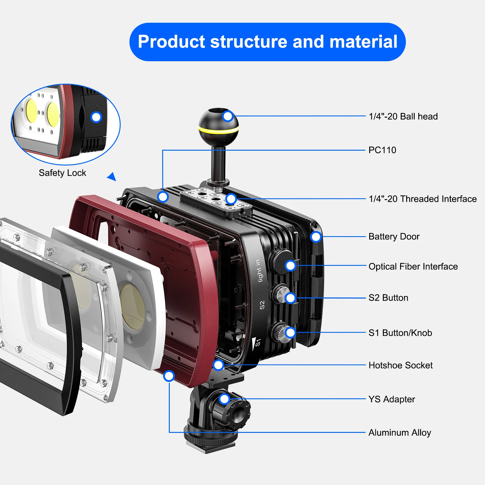 【Посылка включает в себя】 Зарядное устройство * 1, руководство пользователя * 1, YS адаптер * 1, 1/4 " -20 шаровая Головка * 1, волоконно-оптический кабель * 1, водонепроницаемый Светодиодный светильник * 1