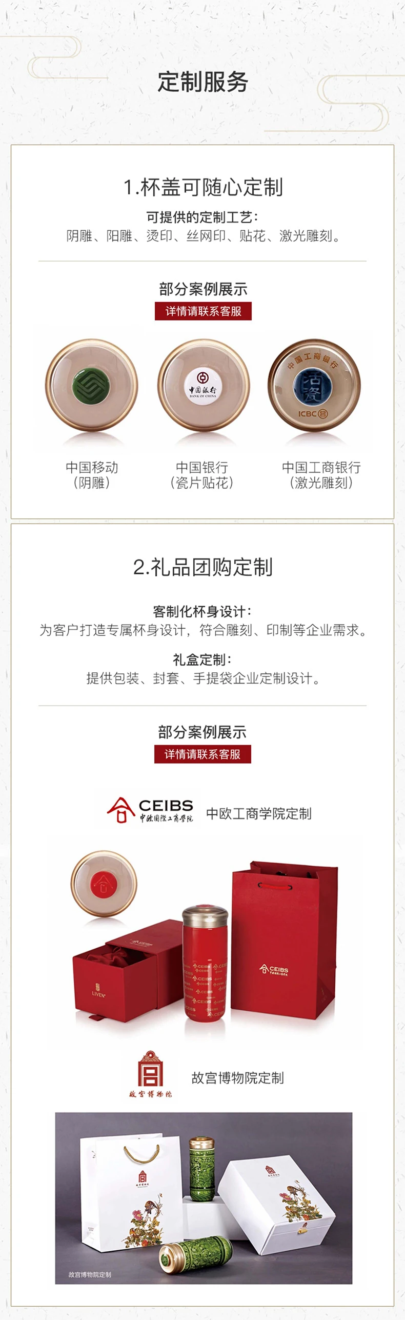 Крышка чашки может быть настроена по желанию, включая резьбу Инь, резку Ян, горячее тиснение, шелкографию, наклейки и лазерную гравировку. Поддержка подарочной группы, изготовление на заказ, индивидуальный дизайн корпуса чашки и создание эксклюзивного дизайна корпуса чашки для клиентов, который отвечает потребностям предприятий, таких как гравировка и печать. Изготовление на заказ подарочной коробки, предоставление индивидуальных дизайнов для упаковки, конвертов и сумок.