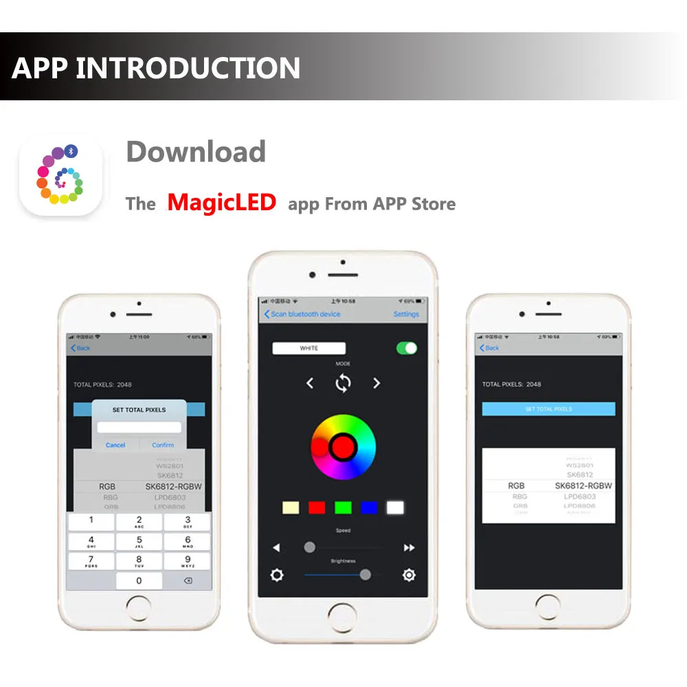 Метод управления: APP-Bluetooth-IOS8.0 или Android 4,4Входное напряжение: 5-24 В постоянного токаПиксель: 2048Разъем: 3pin/4pinРасстояние управления: 20 мВес изделия: 40 г;Размер изделия: 85 мм * 45 мм * 22 мм;Поддержка IC: WS2811 WS2812B WS2813 WS2815 WS2801 SK6812 P943S P9411 P9413 TX1812 TX1813 SK6812-RGBW SM16703 UCS1903 TM1804 LPD6803 LPD8806 APA102 GS8206 gs8208208