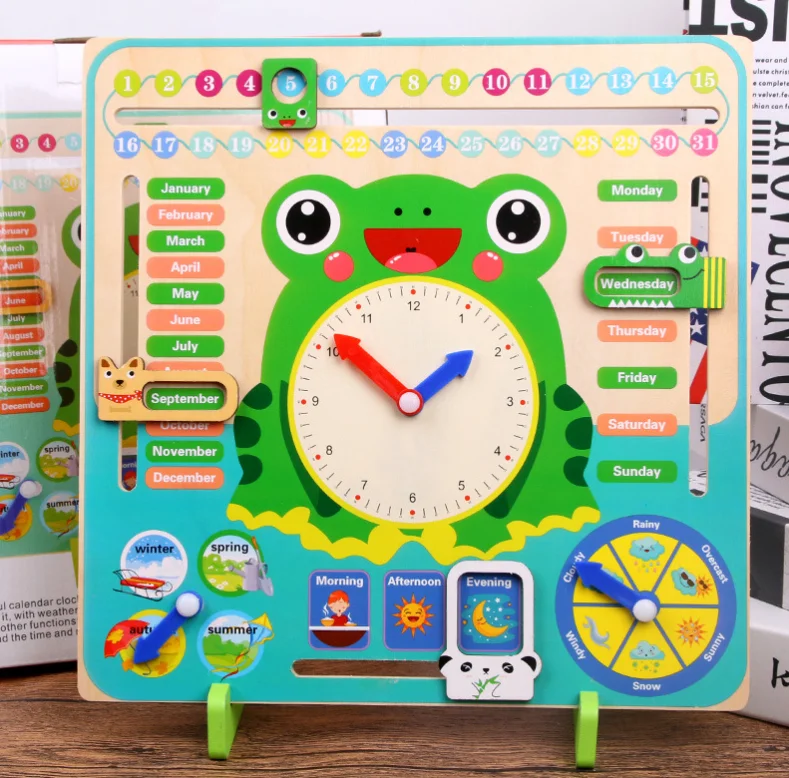 Многофункциональные 7 в 1 деревянные часы Лягушка Календарь Дата погода доска игрушка для детей развивающие деревянные игрушки для детей обучения