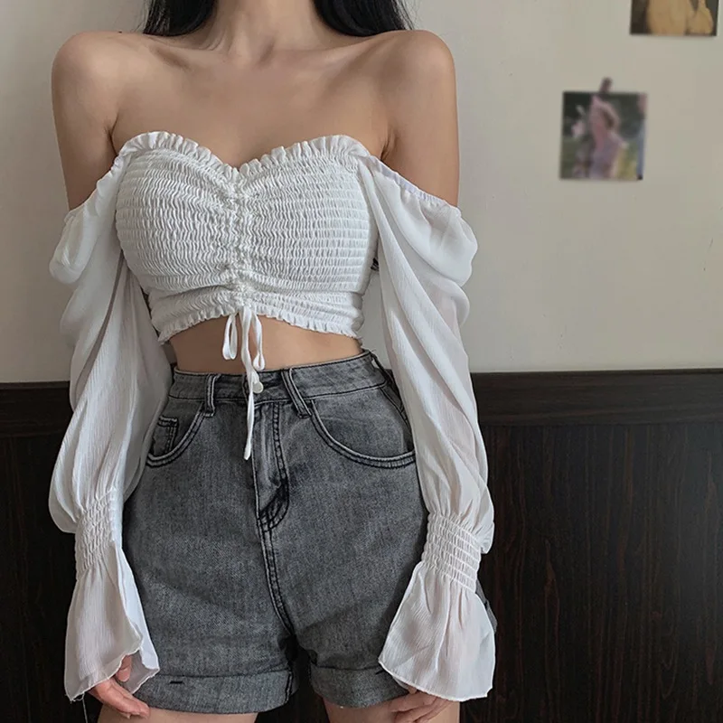 Женская однотонная блузка с квадратным вырезом, плиссированная привлекательная шифоновая рубашка до пупка с длинным рукавом, топ, один размер, женская блузка
