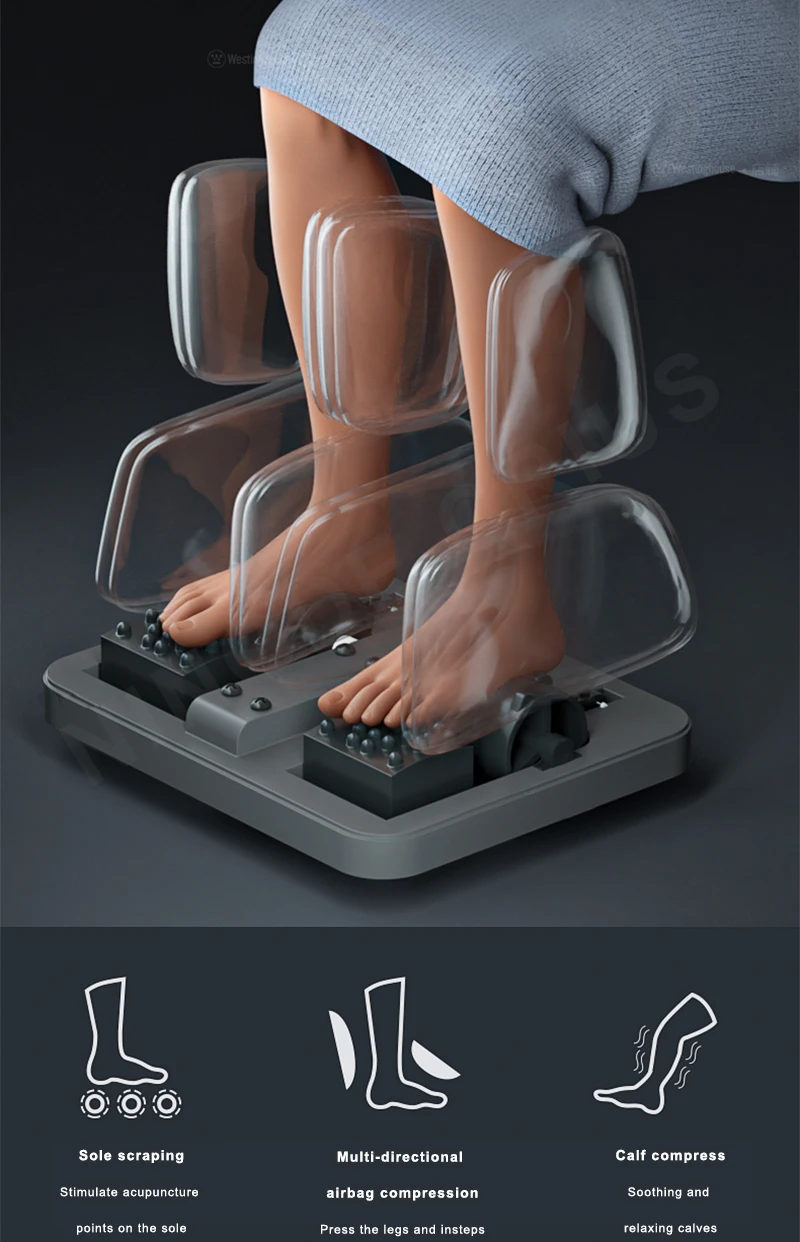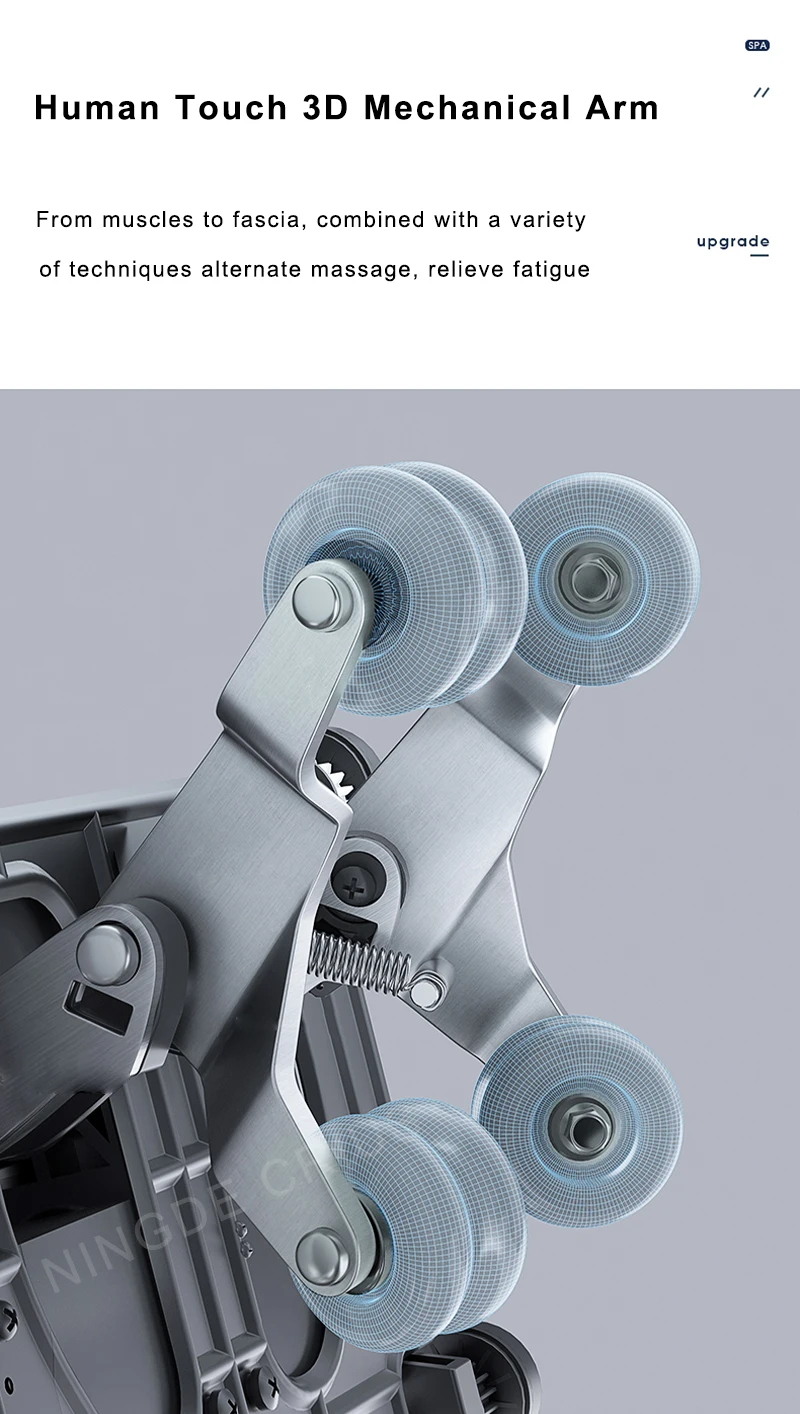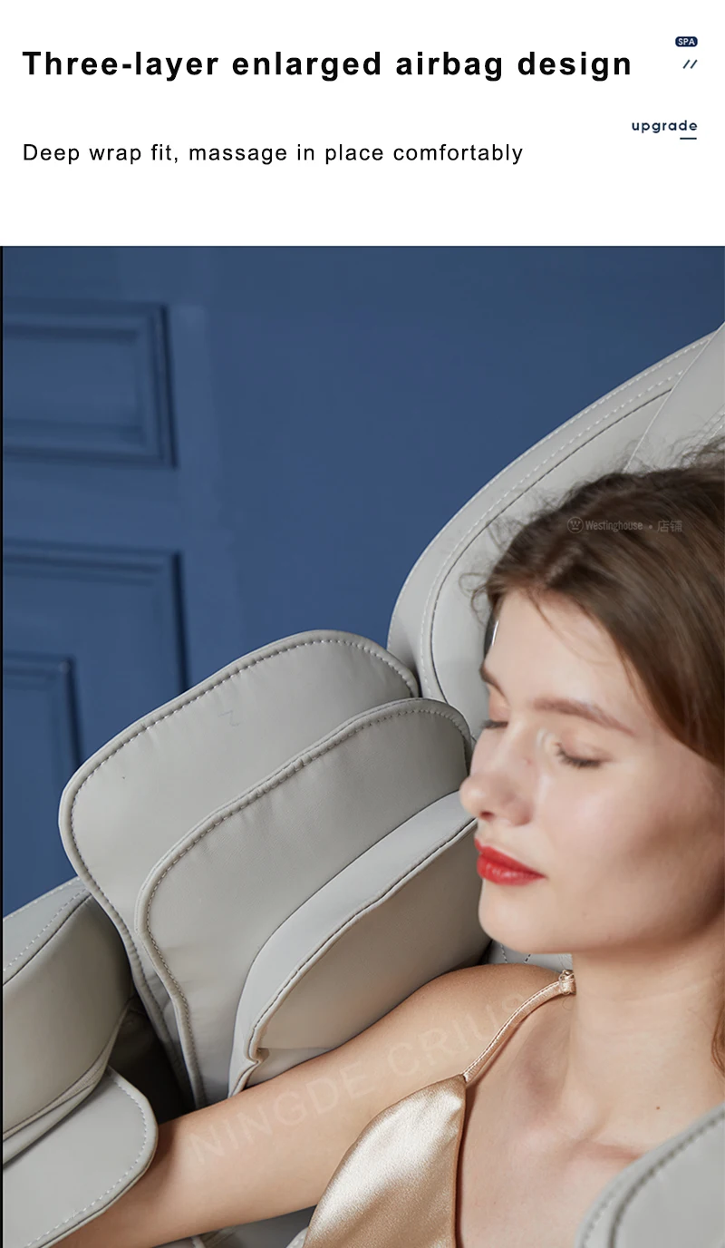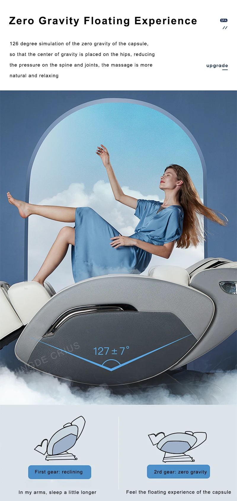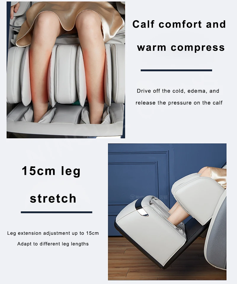 Функции: 1. Нулевое положение G/функция качания 2. Двойной SL форма трека механизм 3. Воздушные программы давления от головы и шеи до рук и подошвы. 4. Беспроводной Bluetooth аудио 5. Массажный ролик для ног 6. Подлокотник блокирует спинку 7. Функция нагрева 8. Растяжка для ступней 9. Спинка и икры могут быть подняты и откидываются отдельно. 10. Шестироликовый мягкий манипулятор 11. Массажное кресло может вернуться в исходное положение при выключении питания.