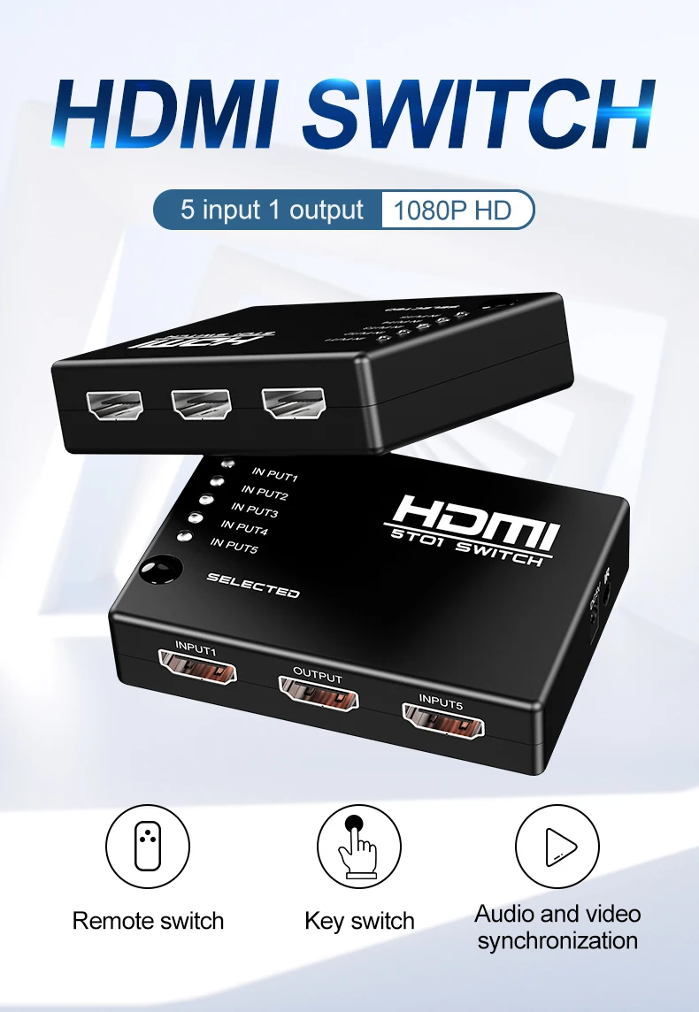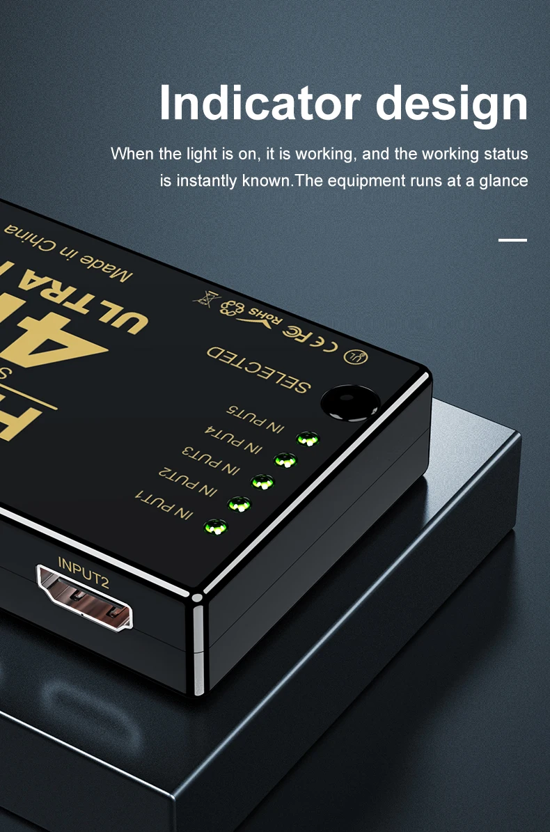 Это мини-переключатель HDMI 5x1, выход 5 входов 1 с ИК-пультом дистанционного управления. Вы можете легко переключаться между тремя источниками HDMI, такими как dvd-плееры, игровые консоли и многое другое. Когда одно устройство выключено, коммутатор автоматически выберет следующее устройство, или вы можете использовать пульт дистанционного управления, чтобы переключиться на другое устройство HDMI.