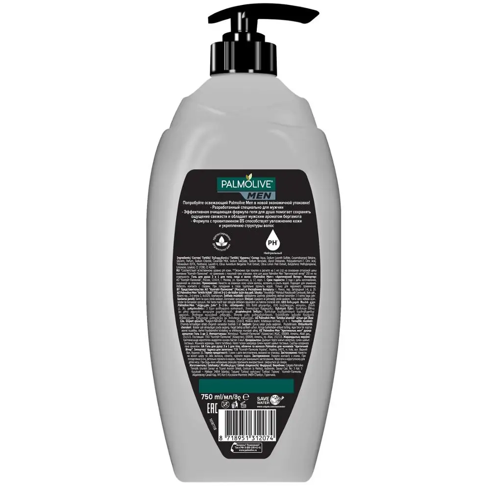 Попробуйте освежающий Palmolive Men в новой экономичной упаковке! - Разработанный специально для мужчин - Эффективная очищающая формула геля для душа помогает сохранять ощущение свежести и обладает притягательным ароматом бергамота - Формула с провитамином B5 способствует увлажнению кожи и укреплению структуры волос Нейтральный pH* Протестировано дерматологами