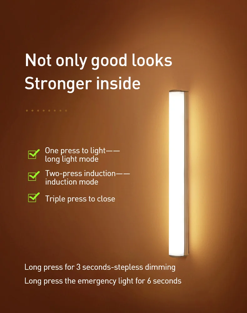 Item: Strip sensor light Brand: Whale and Light Power supply mode: charging Model: LN Strip Light Main scope of application: corridors, leisure and entertainment venues, corridors, hotel rooms, hotel lobbies, exhibition halls, home places Light color: warm light white light Light source power: 1.2-14.4w (W) Applicable occasions: wardrobe, kitchen, bedside Switch type: inductive constant light Additional features: stepless dimming, emergency light Applicable places: corridor, corridor, bedroom Shade material: ABS aluminum alloy Light source type: led light Voltage: ≤36V (V) Dimensions: 150*19*17 (mm) Style: modern and simple