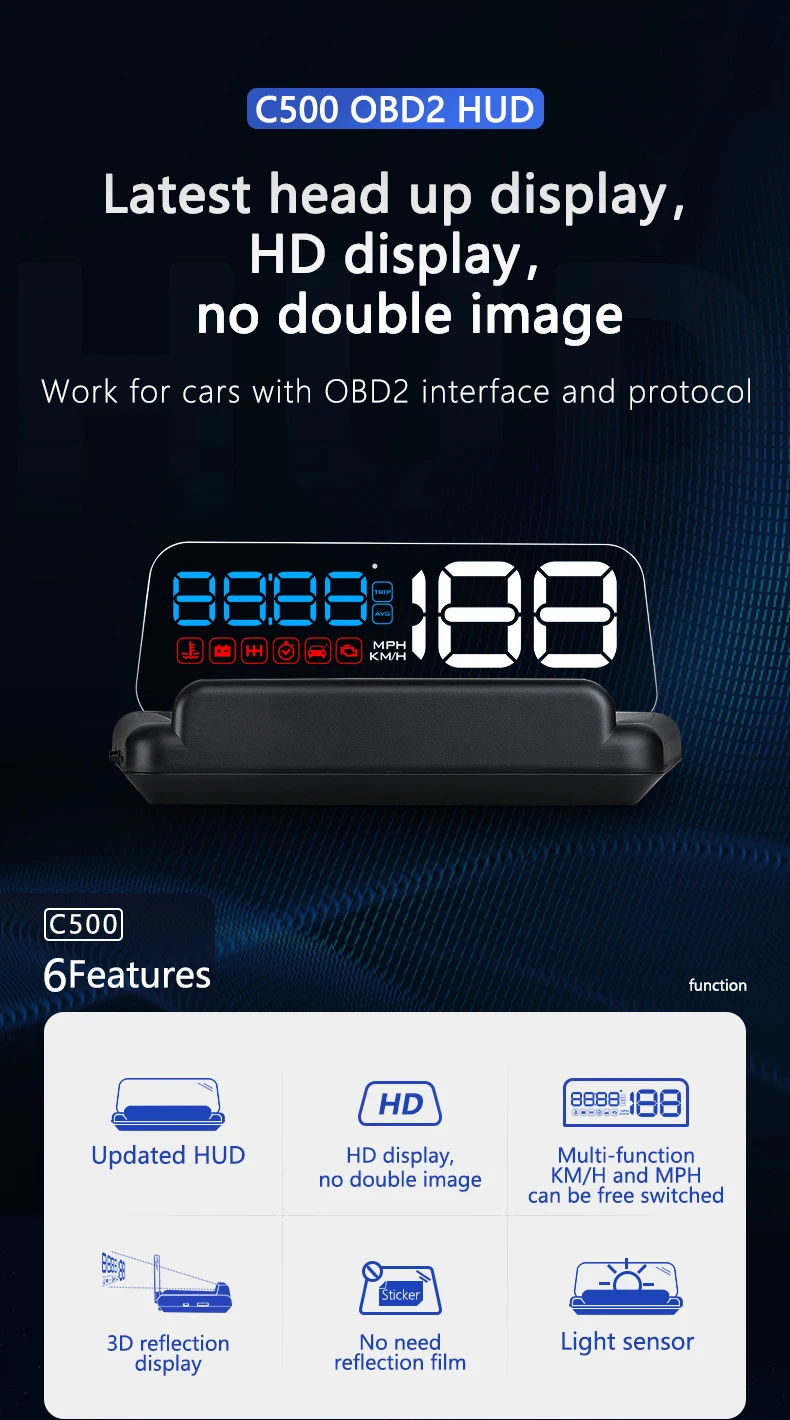 Название бренда: технология DATONG Провод или беспроводной: проводной Название размера: 80*45 см Выходная частота: HUD OBD C500 Номинальная мощность: HUD OBD C500 Название продукта: дисплей Сигнализация для автомобиля: высокая скорость, усталость при вождении, низкое напряжение Hud: проектор на лобовом стекле Новинка: автомобильные аксессуары Hud C500 : OBD2 EUOBD Материал: пластик, электронные компоненты Аксессуары для автомобилей: аксессуары voiture Hud C500 funtion : RPM, скорость, напряжение, температура воды