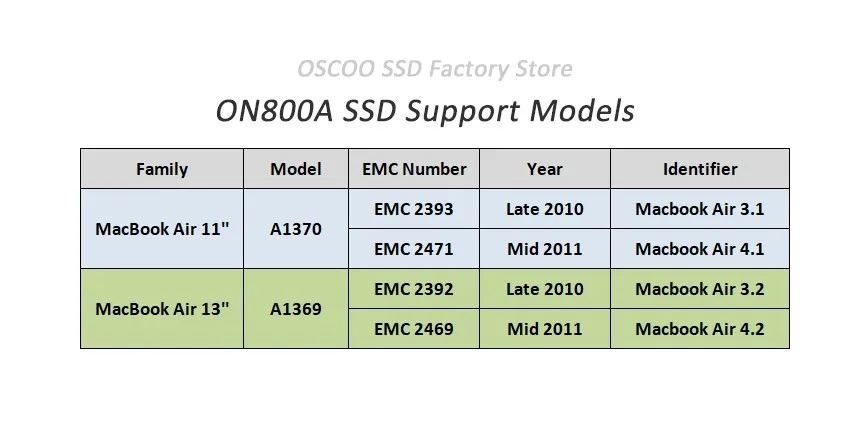 Этот ON800A SSD только для 2010-2011 лет Macbook Air A1370 / A1369, не подходит для любого другого ноутбука и рабочего стола!
