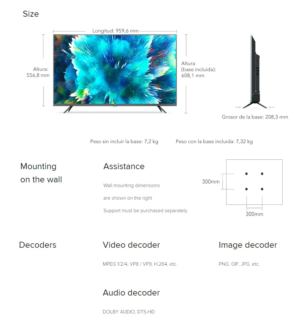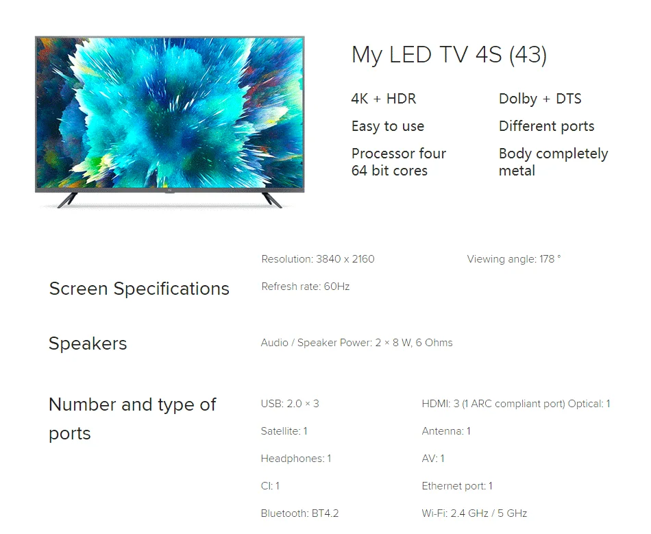 *Resolution : 3840x2160 Support HDR *Backlight : straight down type *Viewing angle : 178 ° *Dynamic response : 8 ms *Voltage : 100–240 V / 50/60 Hz *Standby : ≤0.50W *Operating Power : 85W *2*8W Speaker Support DTS / Dolby Audio *Support DVB-T2+C/DVB S2 *Wifi 2.4G&5G *Bluetooth 4.2 / Bluetooth Remote Control *64 bit Quad-core processor *2GB RAM+8GB ROM *Android TV(Android 9) Netflix/Google Play store/Google Assistant build-in