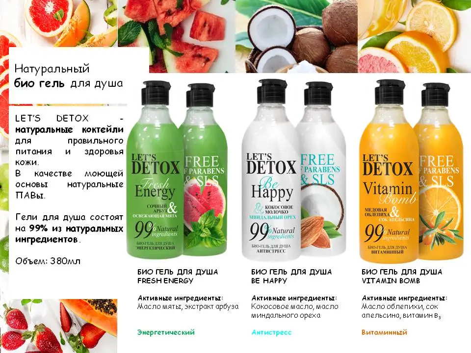 Натуральная линия средств LET’S DETOX создана для правильного питания и здоровья кожи. В основе – сочные фрукты, овощи и спелые ягоды. Все продукты состоят более чем на 98% из натуральных компонентов. Забудьте о суете большого города и погрузитесь в райскую атмосферу тропического острова вместе с соблазнительным ароматом кокоса и миндаля! Кокосовое масло глубоко питает и увлажняет кожу, погружая вас в атмосферу блаженства. Масло миндаля богато витаминами Е, F, A, группы B, благодаря которым масло благотворно воздействует на состояние кожи.