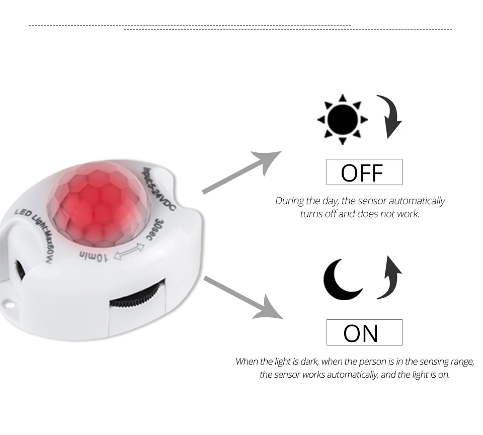 Note: Light control mode: This item can only work in night light or dark environment. The PIR smart sensor automatically turns on when it detects human movement in a dark environment, and can adjust the time to turn off the light. Usually can be used under bed lighting, but also widely used in kitchens, staircase exits, bedrooms, toilets, closets, etc.