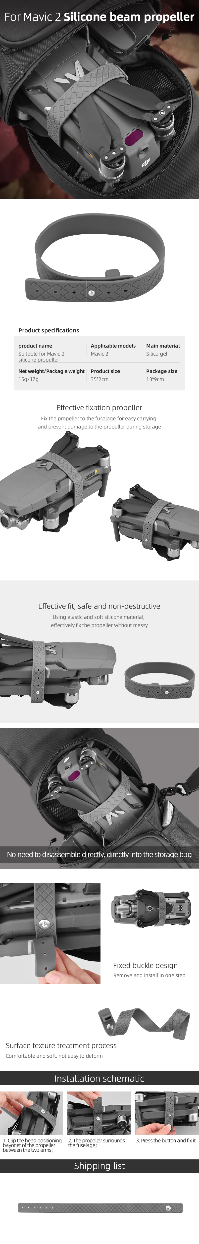 Feature: 1. Fix the propeller on the fuselage to facilitate carrying and prevent damage to the propeller during storage, 2. Using elastic and soft silicone material, effectively fix the propeller without mess, 3. Fixed buckle design: installation and removal in one step, 4. Surface texture treatment process: comfortable and soft, not easy to dye. Description: Material: Silica gel Applicable models: Mavic 2 Color: Gray Net weight: 15g Product size: 35*2cm Packing list: Silicone beam propeller *1 Note:Does not include drone and handbag.