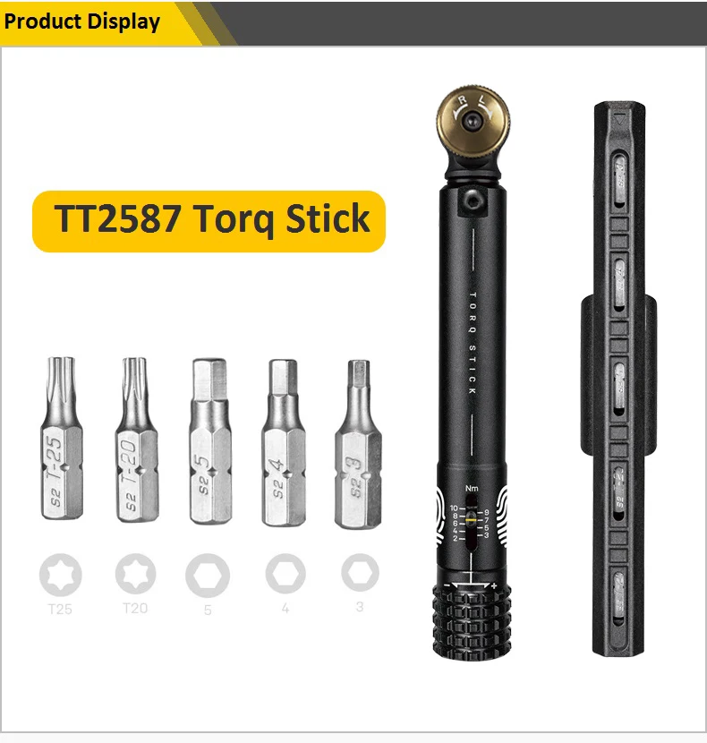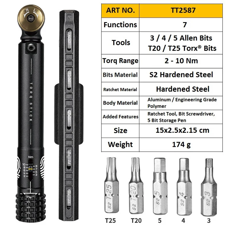 Ручка TORQАрт №: TT2587Описание:Невероятно компактный динамометрический ключ с регулируемым значением крутящего момента 2-10 нм. Стандартная Шестигранная реверсивная трещинчатая головка с регулируемыми заданными значениями крутящего момента позволяет надежно и уверенно затянуть рамку или компонентные болты. Включает в себя пятибитную ручку для хранения с видимой конструкцией окна, позволяющей быстро и легко найти правильный бит.* Функции: 7* Размеры: 15x2,5x2,15 см/5,8 "x1" x0.85» (крутящий момент инструмент)* Вес: 174 г/6,14 унций (инструмент крутящего момента с ручкой для хранения)• Инструменты: 3 / 4 / 5 Allen БитыT20 / T25 Torx®Биты* Диапазон Torq: 2 - 10 нм* Материал бит: Закаленная сталь S2* Трещотка Материал: Закаленная сталь* Материал корпуса: алюминий/инженерный полимер* Дополнительные характеристики: инструмент храповика, отвертка, ручка для хранения 5 бит** Потяните и поверните, чтобы выбрать значение крутящего момента** Поверните колесо храповика для затягивания или ослабления крепежного болта** Звуковой сигнал: динамометрический ключ «нажимает» при достижении заданного крутящего момента** Ручка для хранения, интегрированная с держателем инструмента, защелкивается, чтобы удерживать храповую палку вместе для верховой езды или хранения