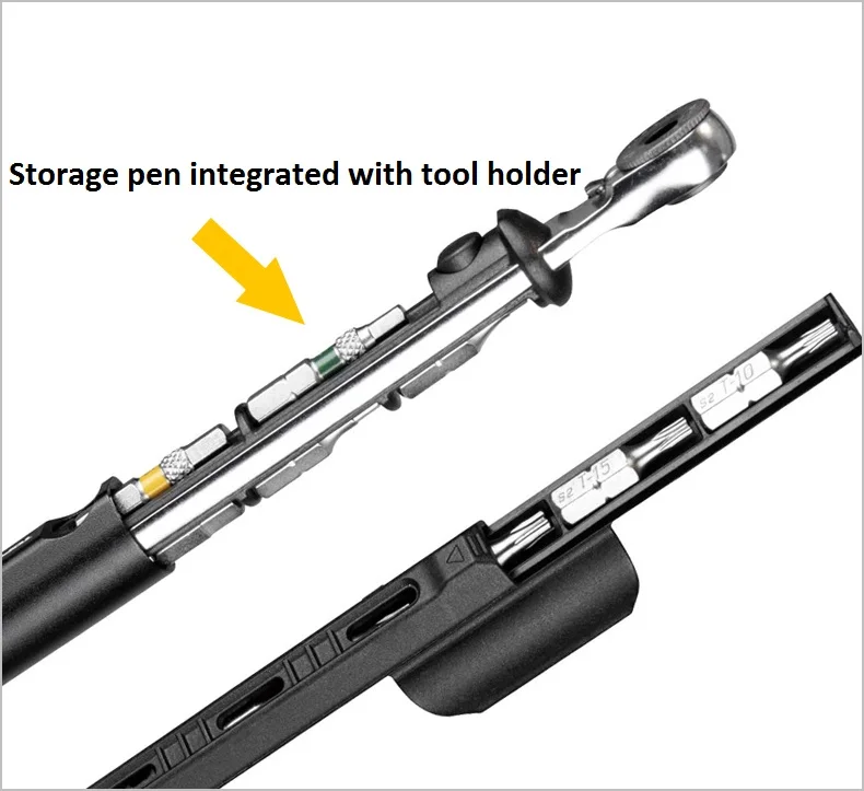 * Дополнительные характеристики: Трещоточный инструмент, отвертка, Трещоточный ключ, Встроенный отсек для пяти бит, 5 бит Ручка для хранения