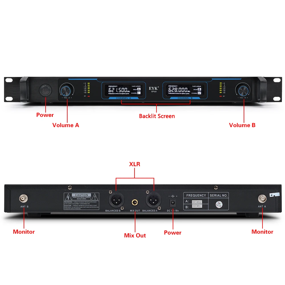 1. Частота УВЧ фиксированная частота частоты A: 607,70 МГц, 649,60 МГц, частота B: 621,50 МГц, частота 628,00 МГц C: 636,80 МГц, частота 643,70 МГц D: 641,50 МГц, частота 645,70 МГц E: 662,20 МГц, 672,30 МГц, пожалуйста, сообщите мне, какую частоту вы хотите, или мы отправим его случайным образом. 2. Передатчик: 2 шт цельных металлических ручных микрофона. 3. Передняя часть приемника: металлическая коробка, выключатель питания, экран с подсветкой, индивидуальная Ручка громкости, индикатор AF/RF, кронштейн для крепления стойки. 4. Обратная сторона приемника: интерфейс питания, два отдельных выхода XLR и один смешанный выход 1/4 ", два интерфейса антенны 5. Диапазон: до 200 футов (до 60 метров), подходит для караоке, речи, вечерние, церковные и т. Д. 6. Батарея передатчика: 4*1,5 V AA (не прилагаются)