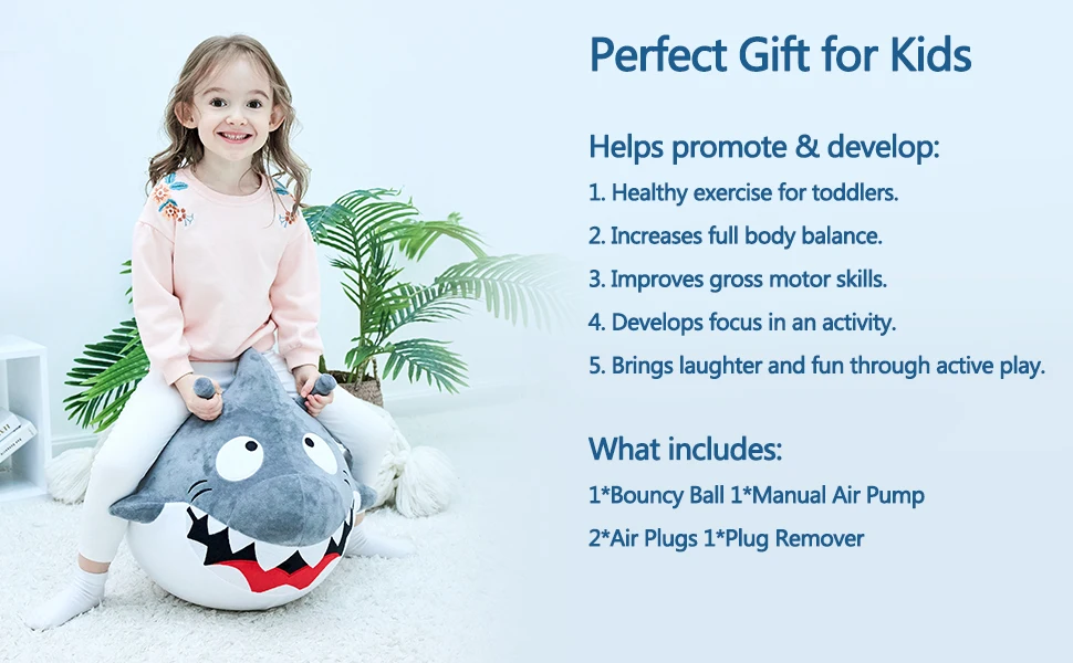 Прыгающая Акула была разработана с широкой базой, чтобы гарантировать, что малыши и дети могут поддерживать их баланс и не колебаться. Отличная игрушка для развития валовых моторики, баланса тела и координации навыков.