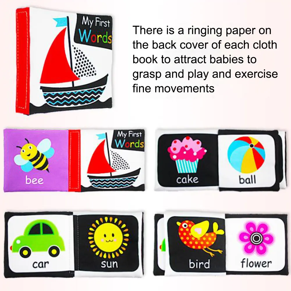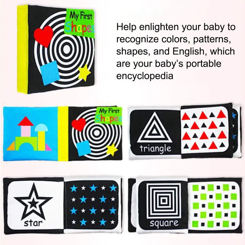-Новорожденный ребенок от 0 до 6 месяцев очень заинтересован в черном, белом и красном узорах. Ребенку полезно смотреть все больше и больше черно-белых тканевых книг, которые полезны для развития визуальных нервов и мозга.