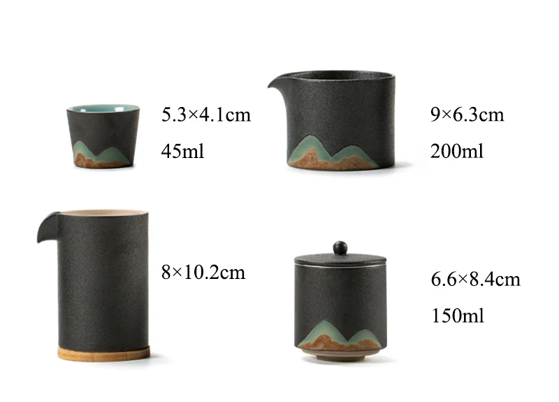 Заварочного чайника: 6,6x8,4 см 150 мл Чайная чашка: 5,3x4,1 см x 45 мл Чай кувшин для воды: 8x10,2 см 200 мл