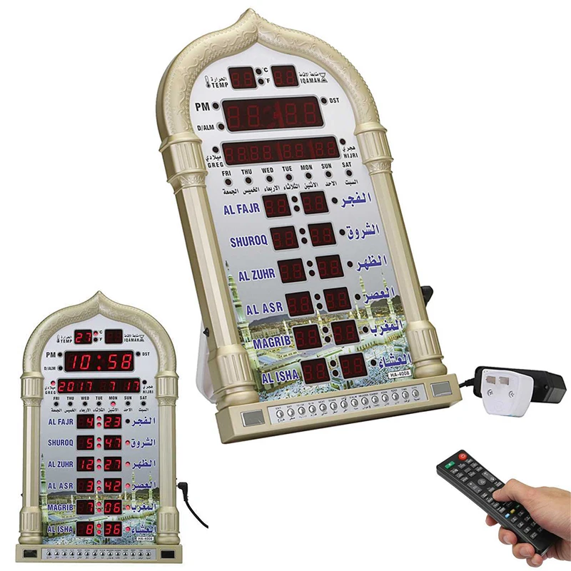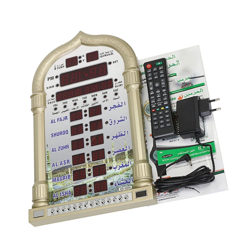 Характеристики: Напряжение: DC12V Ток: 1A Материал: АБС-пластик Размер: 23.8ccmx38.8cm Особенности: -Возможность включения или выключения звука azan отдельно -Отображение температуры, хиджри и григорианские календари -Дневной светильник, экономия времени, полноэкранный светильник -Переключатель регулировки громкости, разъем постоянного тока для питания Посылка включает: Настенные часы (аккумулятор в комплект не входит)-1 шт. 1 x пульт дистанционного управления (не входит в комплект 2 * AAA батареи) 1 х адаптер 1 x Руководство пользователя