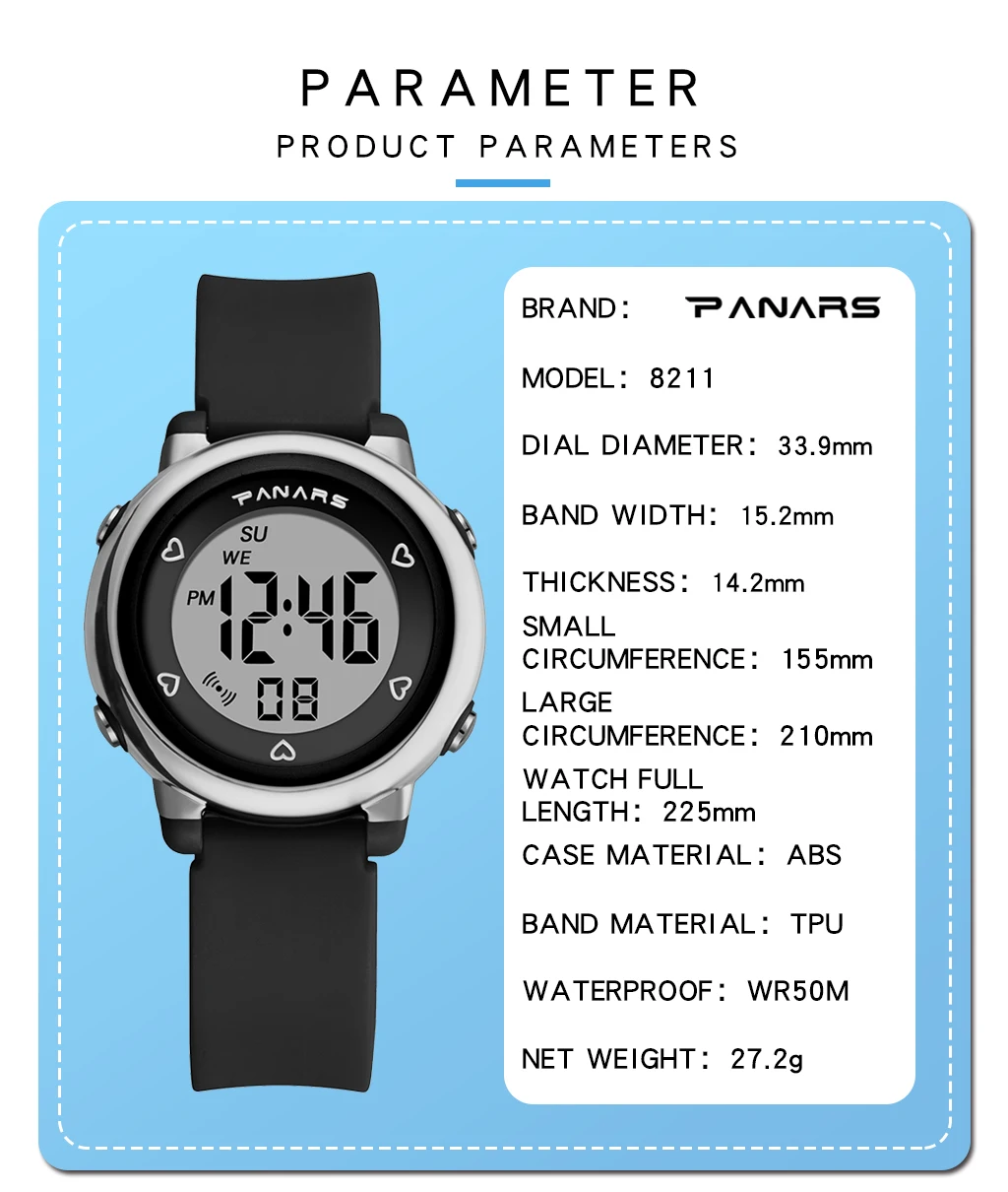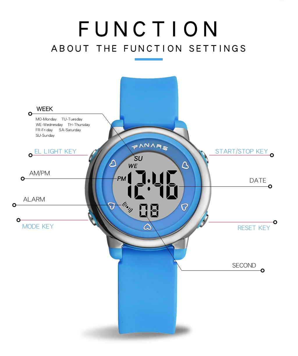 Функция: будильник, день недели, отображение даты, ежечасное время, секундомер, световой дисплей, WR50M водонепроницаемость, 12/24 часовая система