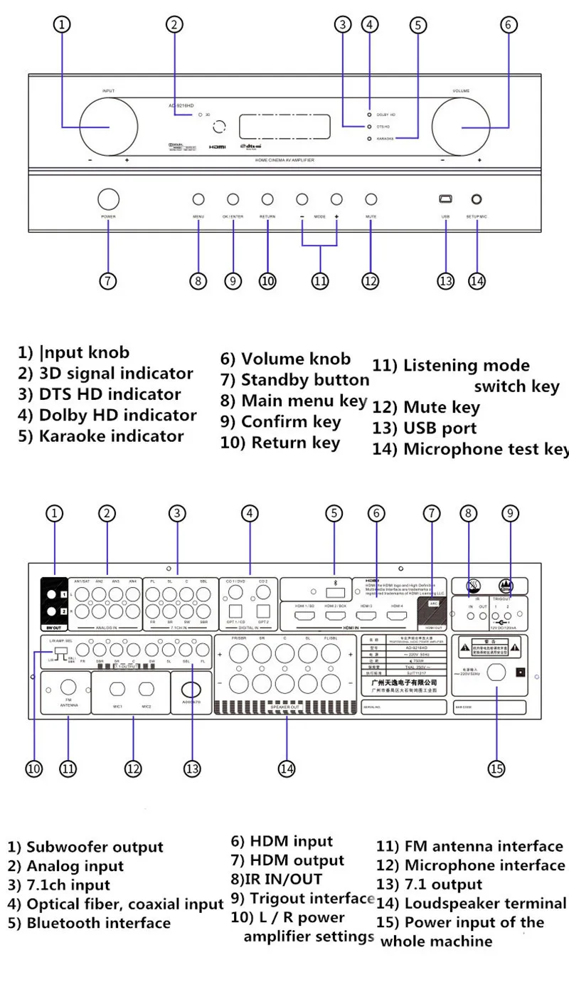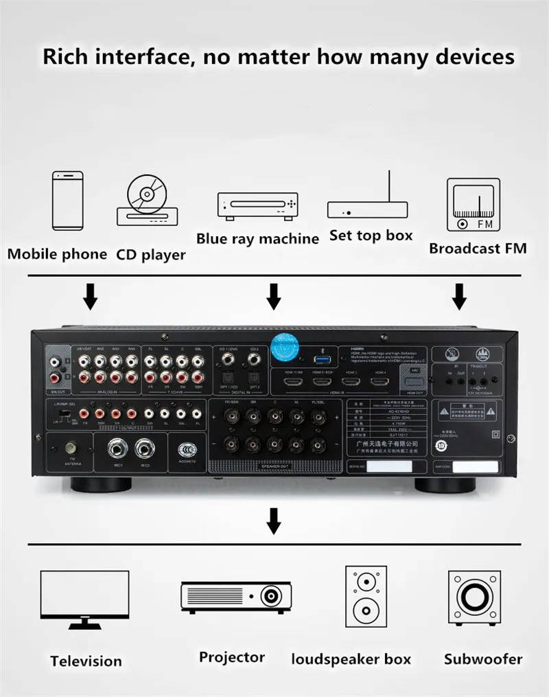 Номинальная выходная мощность (вход каналов, выход φ 1Vrms)≥ 130 Вт (8 Ом, моно, thd = 1%, 1 кГц);≥ 190 Вт (4 Ом, моно, thd = 1%, 1 кГц)Искажение: ≤ 0.05% (1 кГц, нормальное рабочее состояние)Частотный диапазон: 20-60 кГц (+ 1 дБ/ - 3 дБ) (L, R, C, SL, SR)SNR: ≥ 95 дБ (вход 5,1 канала, A-Взвешивание)Поддержка частоты дискретизации цифрового входа: 32k-192kВидео частьПоддержка видеовхода: HDMI/DVI 720P50,720P60,1080i50,1080i60,1080P50,1080P60Поддержка видеовыхода: HDMI/DVI 70P50,720P60,108050,1080i60,1080P50,1080P60ОбычнаяИсточник питания: 220 В переменного тока, 50 ГцПотребляемая мощность: 750 Вт (8 Ω)Общий размер: 430 (Ш) x 350 (г) × 152 (В) ммРазмер посылка: 552 (Ш) × 46 (Д) × 246 (В) ммВес нетто: 12,1 кгВес брутто: 13 кгОплатаРуководство по эксплуатации (1 книга) шнур питания (1 пара) Гарантийный талон (1 пара) сертификат соответствия (1 шт.)Пульт дистанционного управления (1 шт.) батарея (1 пара) fm-антенна (1 пара) Кабель HDMI (1 пара)Аудиокабель (1 пара)