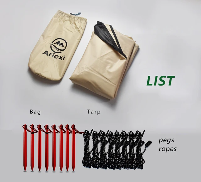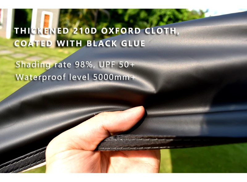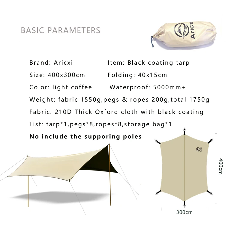 Бренд: Aricxi Размер: 400x300см Материал: утолщенная Ткань Оксфорд 210D с черным покрытием Степень затенения: 98%, UPF 50 +, Уровень водонепроницаемости 5000 мм. Вес: ткань 1550 г, колышки и веревки 200 г, всего 1750 г Цвет светильник-кофейный Список: брезент, колышки, веревки Обратите внимание: опорные стойки не входят в комплект, спасибо