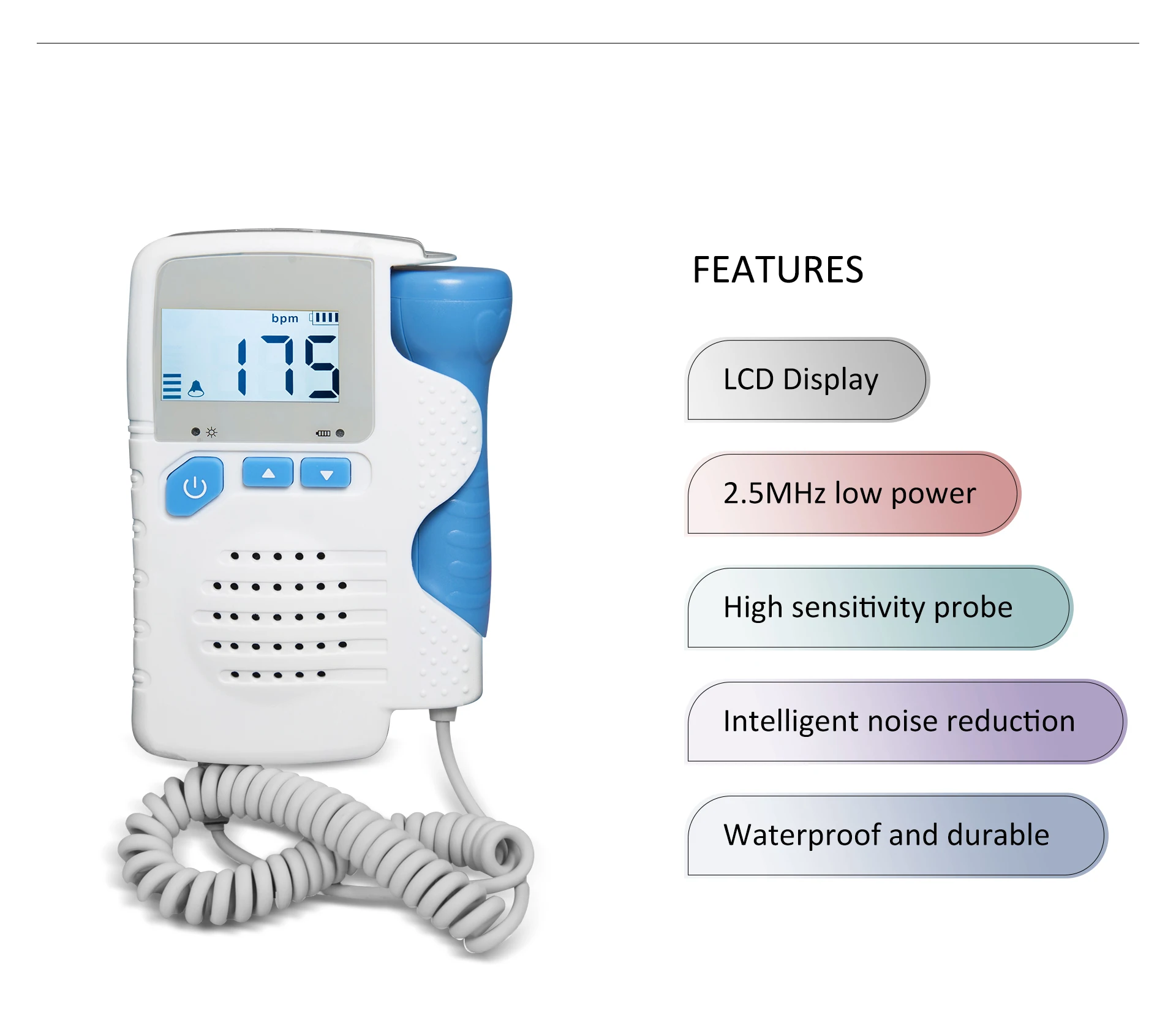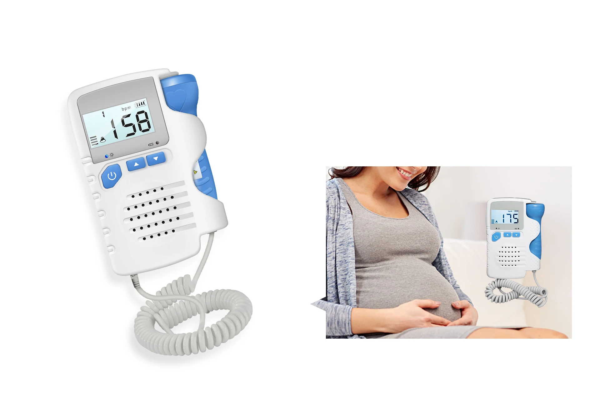 -Вы можете проверить FHR (пульс плода) с помощью большого ЖК-экрана. Кроме того, вы сможете записывать звуки ребенка (кабель для записи не входит в комплект), чтобы поделиться своим счастьем с друзьями.