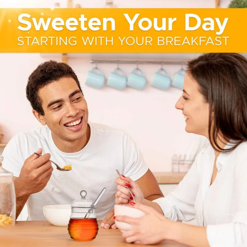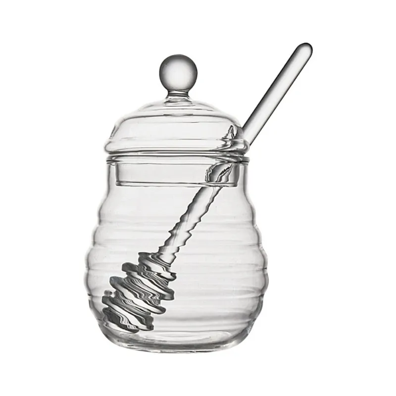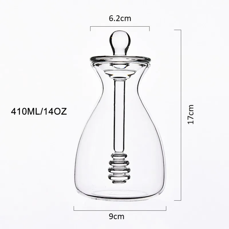 1.SERVE YOUR HONEY ROYALLY MESS-FREE No need to use spoons, forks, or other utensils to sweeten your tea or your pancakes – and forget the rest of your honey jars too. This specially designed honey pot jar will do the trick without mess or extra effort! 2.BEE-AUTIFUL HONEY POT FOR YOUR BREAKFAST TABLE Our honey jar is made of glass and has a stylish bee decor on its dipper, which means that, when you’re not using it, it makes a wonderful piece of décor for your table or countertop! 3.GLASS DIPPER FOR EASE OF USE To make your life easier, we have also designed a glass honey dipper stick for your honey pot. Different from most honey dippers, this one allows for easily controlling the amount of honey you prefer and not a drop more! 4.CONES WUTH A LID TO KEEP YOUR HONEY FRESH AND YUMMY Unlike other honey containers, the pot is covered with a tasteful glass lid that protects its content from dust, insects, or other unwanted… ingredients. And the best part? The dipper is integrated into the lid so that you won't have to look for it or wash it separately! 5.RURBY,STYLISH DESIGN MEETS IDEAL 14 OZ CAPACITY A practical honey jar with its own honey dipper stick does not have to be boring-looking. Also it should be able to drip more than those mini honey jars that serve tiny drops! That’s why we have combined a modern, minimal honey pot jar design which can also hold up to 14 oz of honey – just for you! Package including:1/4 pcs honey jar