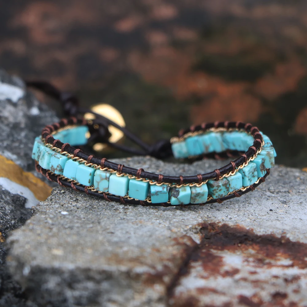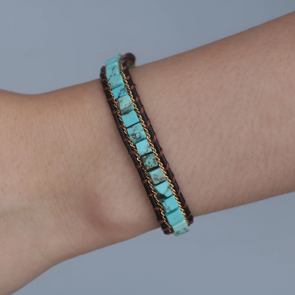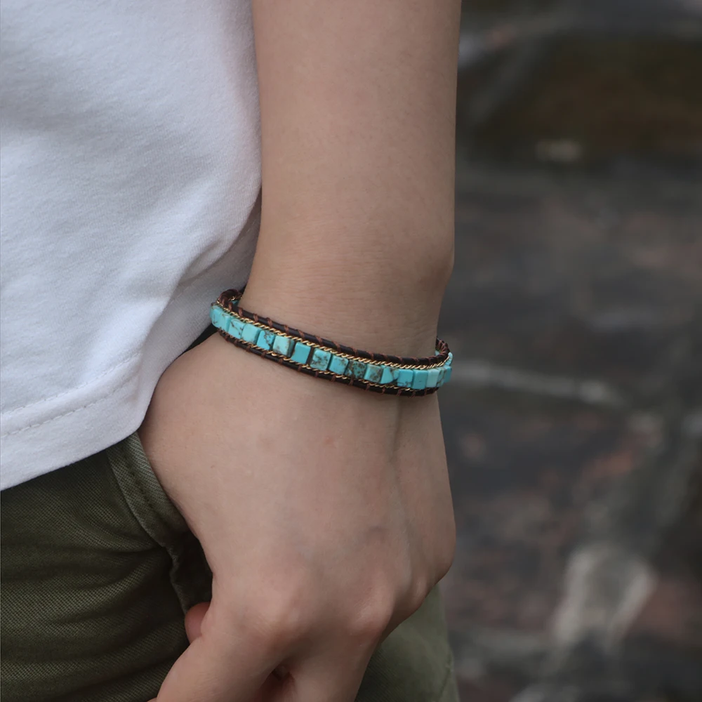 EDOTHALIA трендовый натуральный камень квадратный кожаный браслет с бусинами для женщин мужчин подарок любовника плетеный браслет ручной работы Bijoux -- 4*4 мм квадратный Бирюзовый бисер -Примерно 16-22 см регулируемая длина